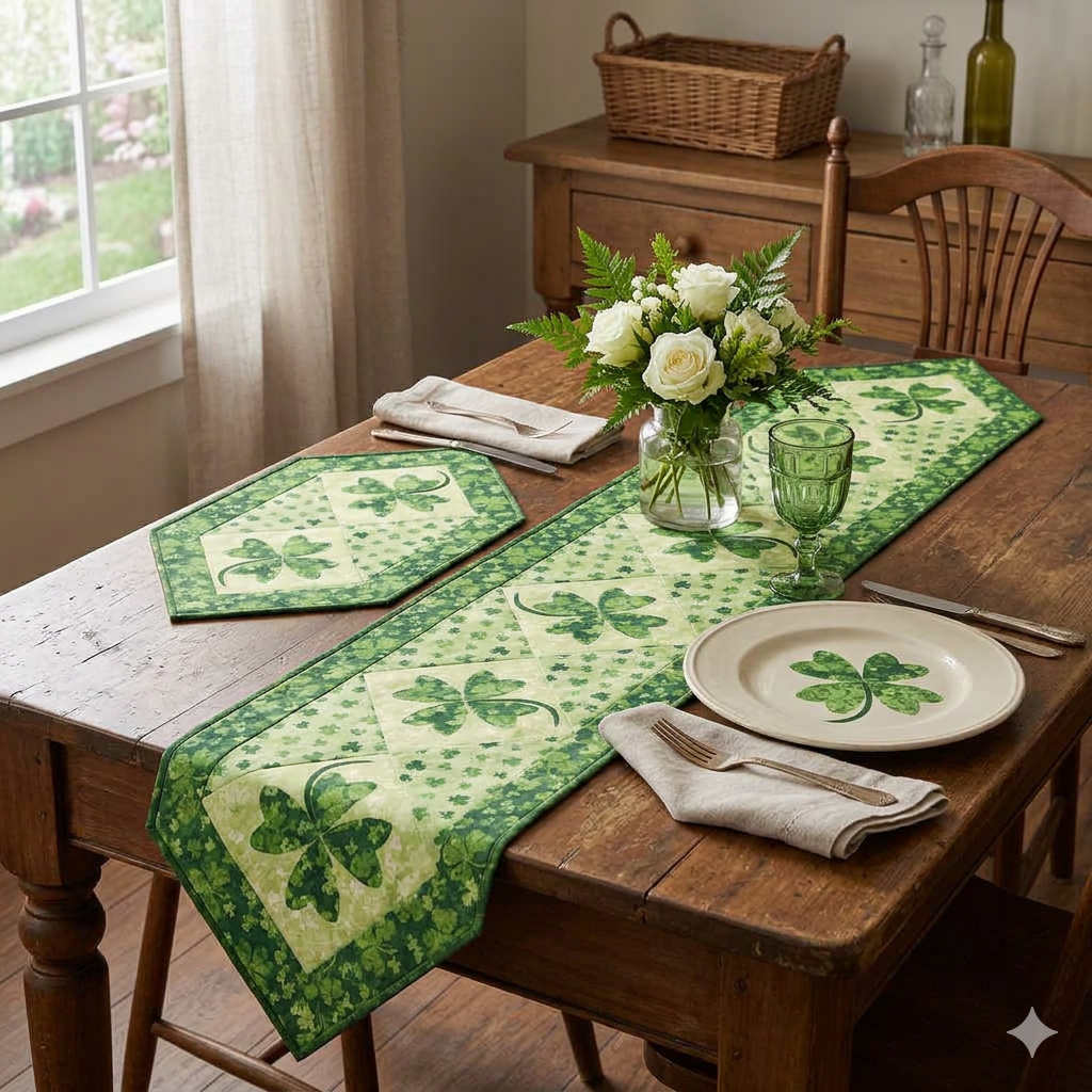 Seasonal holidays and special events with this quick and easy table set pattern. Pattern includes heart, shamrock, Easter egg, flower, leaf, pumpkin, snowman, and Christmas tree applique shapes, and sizes from placemat to 6-block runner.