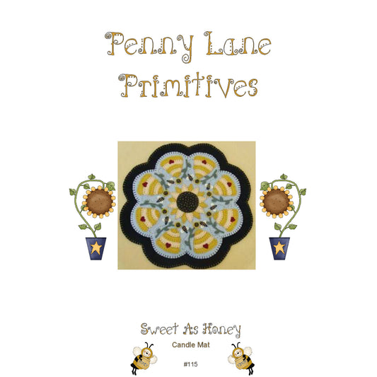 Regular price $10.00 USDRegular priceUnit price / perSale price $10.00 USDSweet As Honey Sunflowers & Bees Penny Rug Candle Mat PLP-115e - Downloadable Pattern