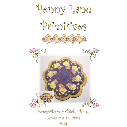 Regular price $10.00 USDRegular priceUnit price / perSale price $10.00 USDEverywhere a Chick, Chick! Penny Rug Candle Mat with Ornies PLP-134e - Downloadable Pattern