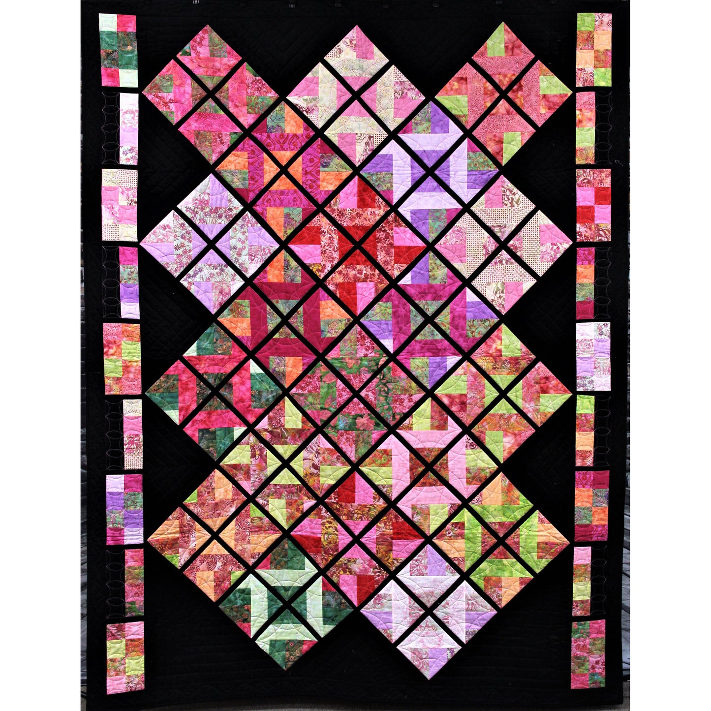 On point quilt is fun and easy with this great pattern. Designed to give a stained glass window effect bright colors make it stand out. Jelly Roll® and Bali Pop® friendly, all of the strip is used with nothing left over. Your choice of fabric will make this quilt uniquely yours. Finishes 60" x 80" as shown, but can easily be enlarged with the addition of extra 2 1/2" strips.