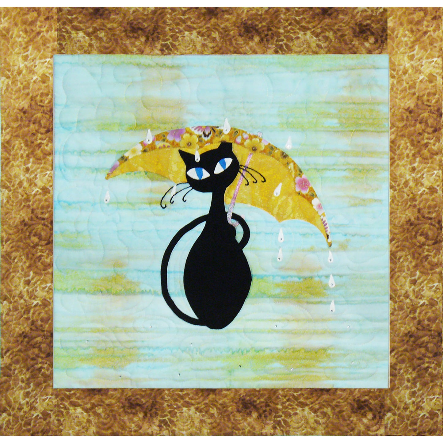 Of course this cat's name is April! April, like most cats, doesn't like getting wet so she got out her new spring umbrella for protection from the April Showers in the unique applique wall hanging.