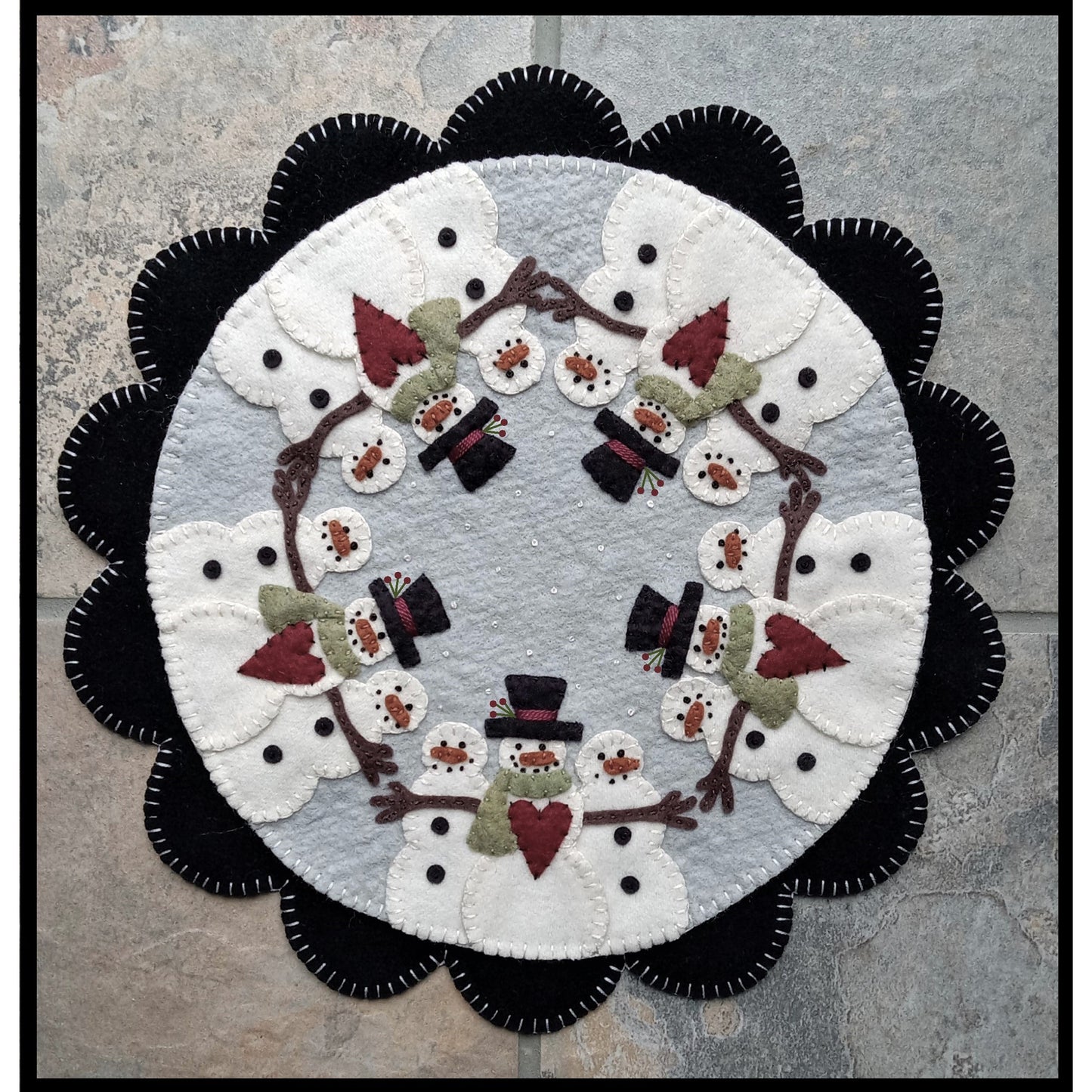 These sweet snowy friends are such a delight to create! Stitch them up using wool felt or wool. The scalloped version measures approximately 13 inches. The round version, without the black scalloped layer, measures 10 1/2 inches and fits perfectly on a metal stand. This design could also be enlarged to make a fun Christmas tree skirt!