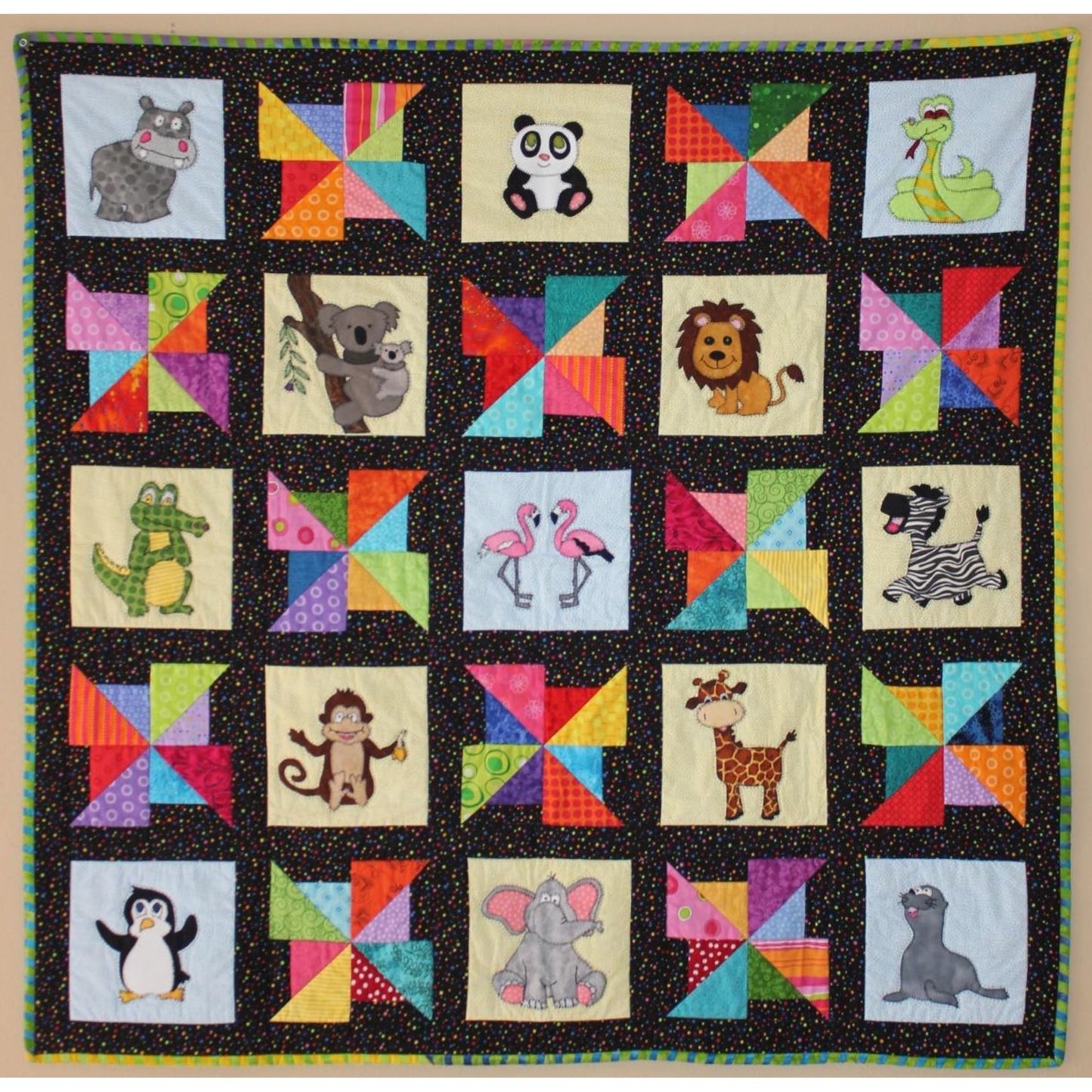 What could be more fun than a trip to the zoo? Watch the elephant, zebra, giraffe, and monkey playing! Re-live the adventure with our whimsical 45" by 45" child's quilt pattern, featuring your favorite zoo animals and colorful pieced pinwheel blocks. The zoo quilt would be a fabulous gift for that special someone in your world, but you might just want to keep it yourself to snuggle under.
