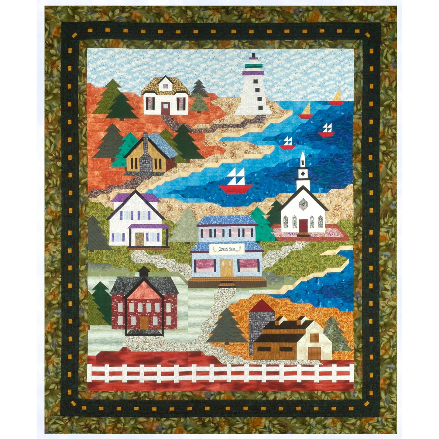 A delightful pictorial quilt pattern! A school, church, general store, farm, cabin, quaint seaside home and lighthouse nestle on the colorful coastline landscape surrounded by trees and the lapping water of the ocean. The design is created using Lorraine's "connector corner" technique and "section piecing". The scene is divided into 14 different sections. Each section is shown separately with cutting measurements. Connector corner (snowball corners) sizes also show on the section diagram. There are only straight seams but many pieces. Not a difficult quilt pattern but very time consuming.
