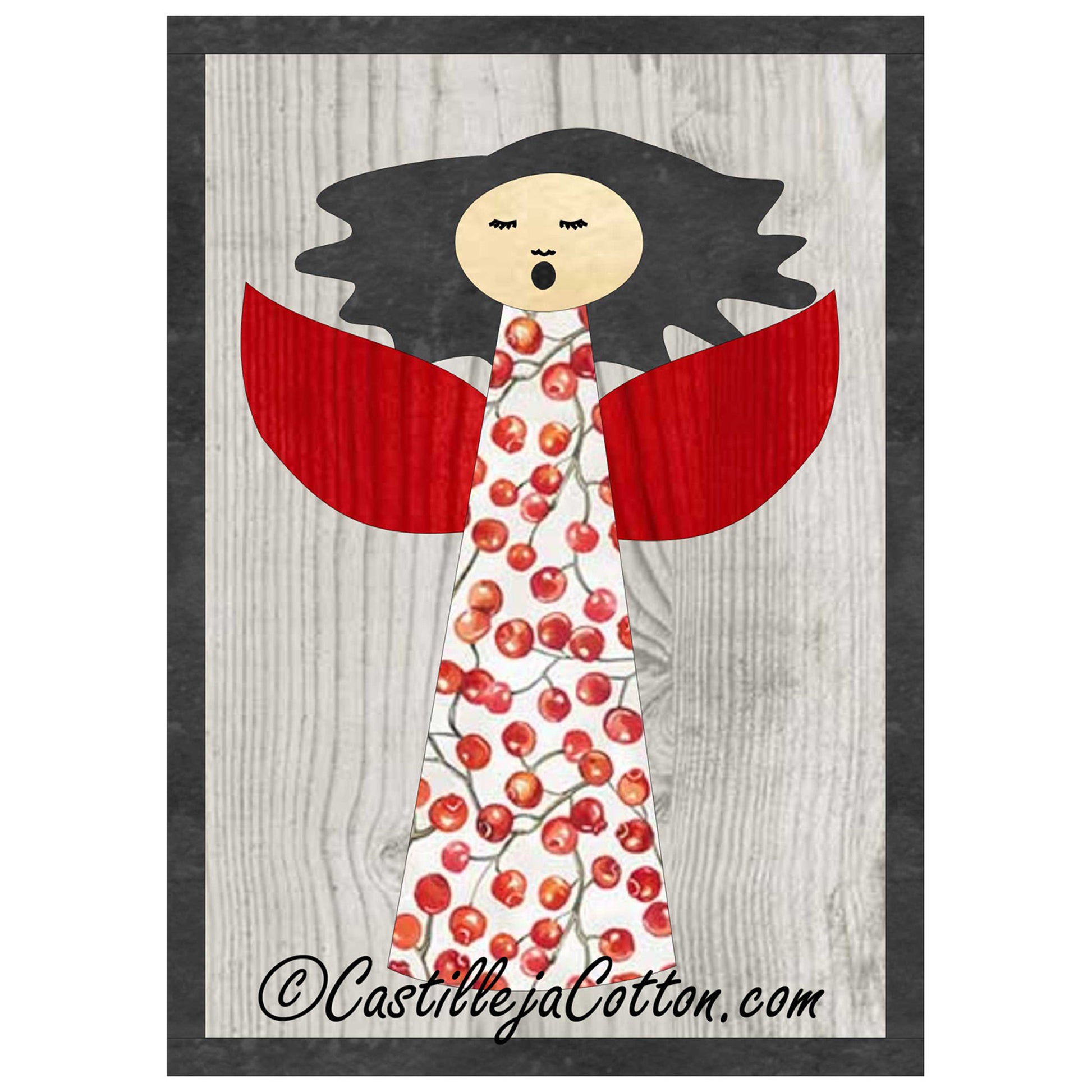 Fusible applique angel mug rug. Singing angel applique mug rug pattern. This could also be used to create a mini wall hanging. Great addition to your Christmas decor or anytime of year.Fabric shown in the sample is Northcott Fabrics The Scarlet Feather.
