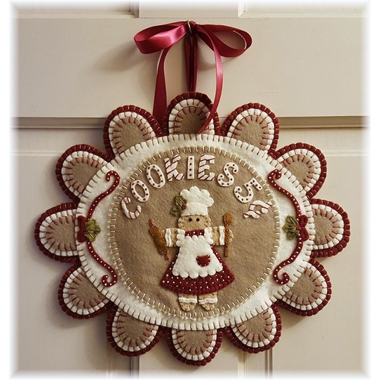 This is just the 'sweetest' little gingerbread baker! Create this adorable design using wool or wool felt. There are templates included to make peppermintse (instead of the holly) to give it less of a Christmas look. Display on a wall or table all winter long!