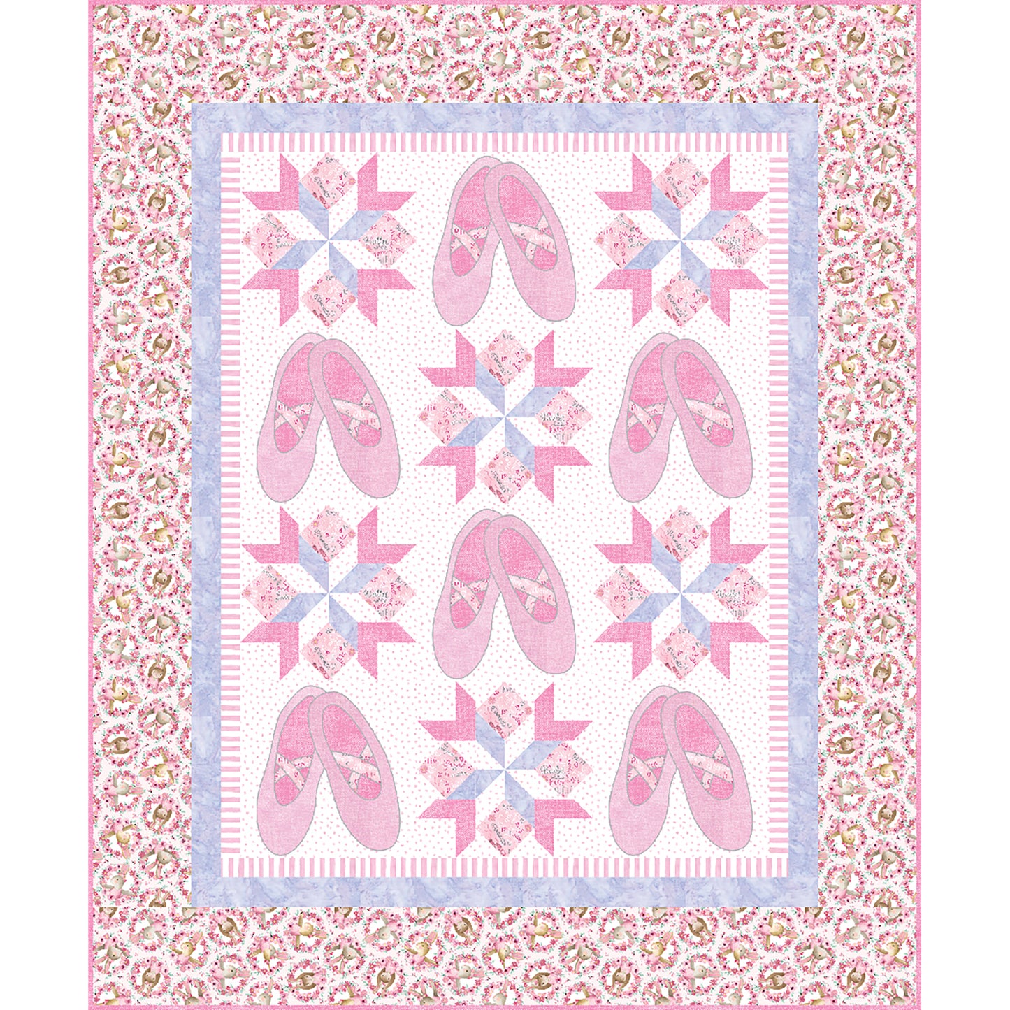 Pieced and fusible applique quilt pattern with full-size reversed templates and full size placement drawings. The quilt pattern shows how to add real ribbons to the ballet shoes. An applique pressing sheet is helpful with this quilt pattern.