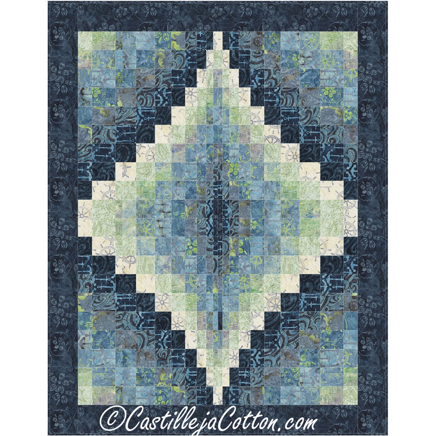 This quilt pattern is easy to using make 2 blocks. Strip piece construction. Fat quarter friendly. Fabric line shown in sample quilt is Tonga Oceana by Timeless Treasures.