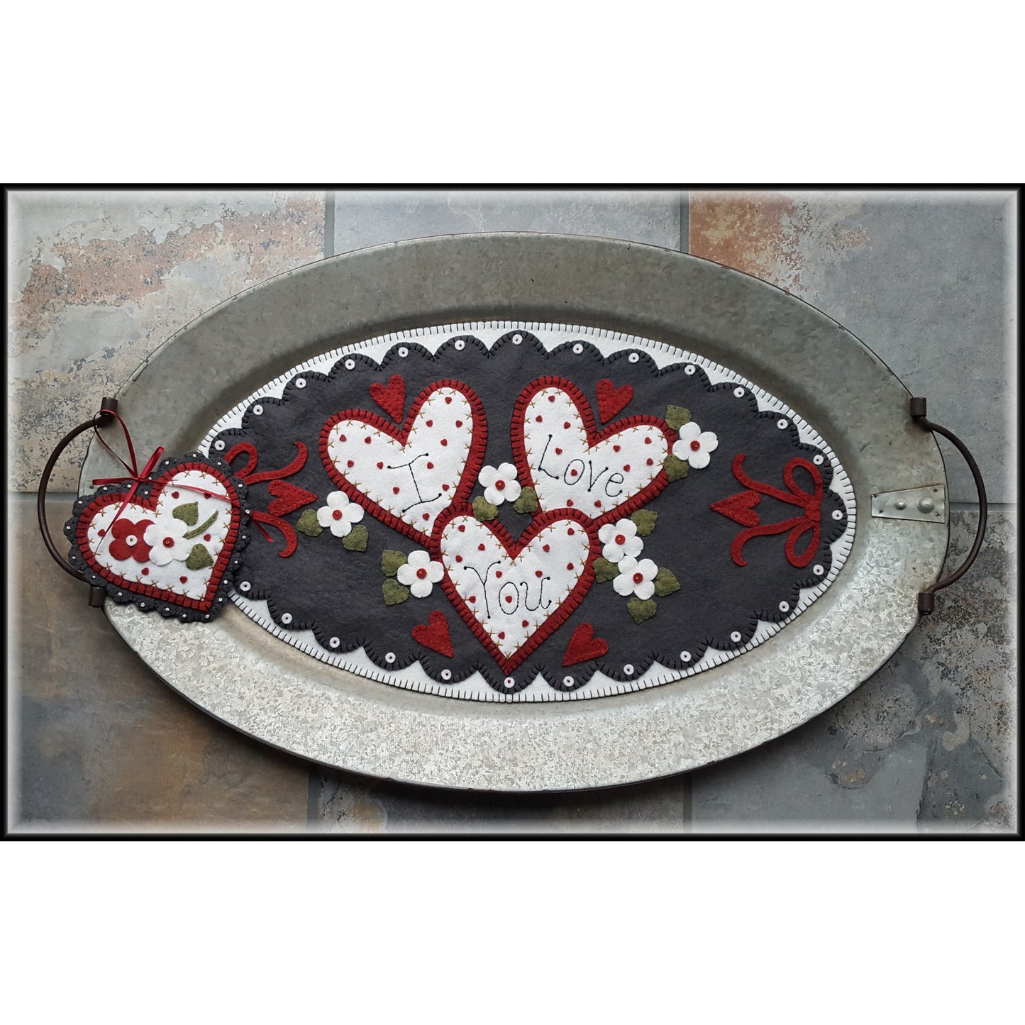 Stitch up something pretty to display on Valentine's Day! The table mat measures 12 1/2" by 22" and fits nicely into a rustic tray. The little mini mat measures approximately 5 1/2" by 5 3/4" and would be simply perfect for a cabinet knob or anywhere that needs 'just a little something'. Create these fun pieces using wool or wool felt.