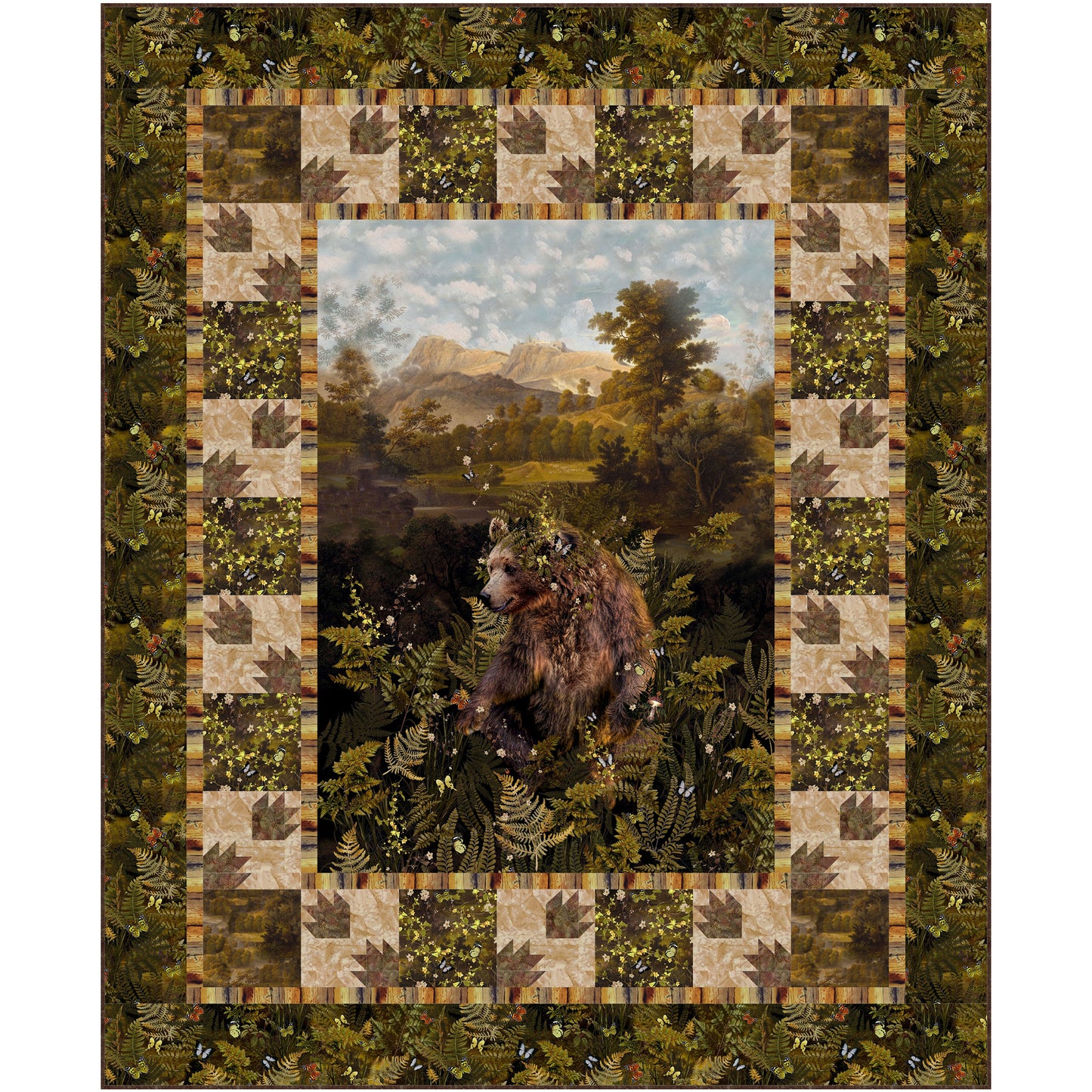 Stunning panel quilt featuring a scene of a bear surrounded by ferns with trees and mountains in the background. The center panel is framed by pieced bear paw blocks alternated with plain squares borders. Includes a paper stencil to free motion stitch ferns in the plain squares of the border. This lap/throw quilt would make a great cabin quilt or the perfect gift for any nature lover. Quilt pattern features the Hoffman CA Among the Ferns fabric line.