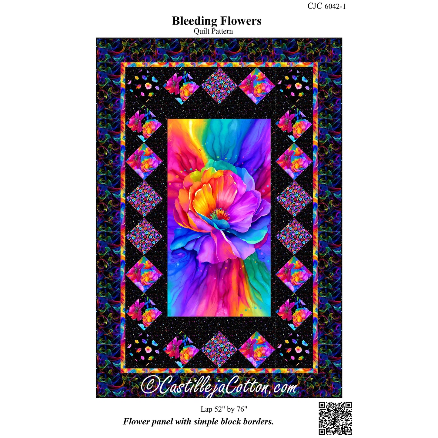 Bleeding Flowers quilt pattern features a flower panel (24" x 43") with simple block borders. Fabric shown in the sample quilt is Timeless Treasures Fabric Petal Power. Colors: bright, black