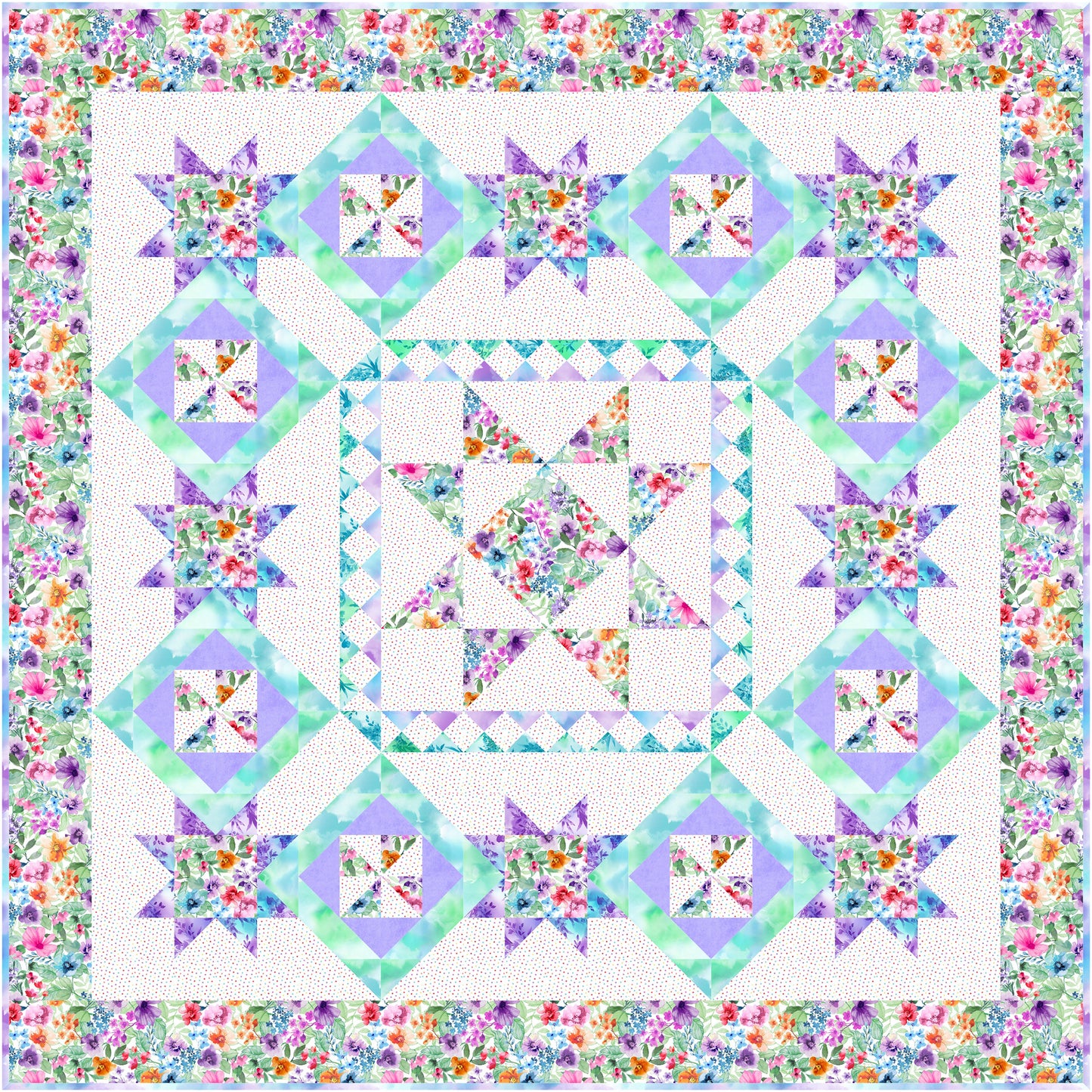 In Bloom Bright, bright pastels represent the importance of color in our lives and the happiness it brings. Watercolor blossoms burst with confidence amid clouds of swirling background tones and loose petals. White grounds balance the intensity of color saturation and create resting places for the eye as it travels across a garden of color. Quilt finishes at 78" x 78".