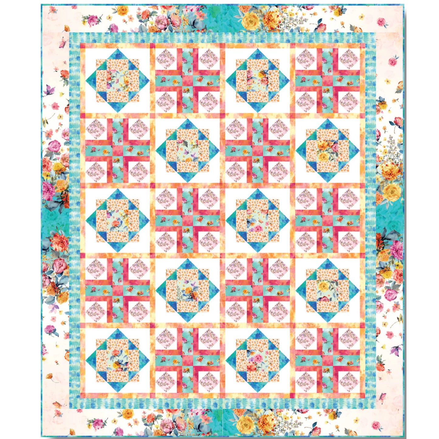 Vibrant quilt pattern featuring beautiful floral pattern interchanging two different blocks with a total of 20 blocks. Bright and fun for a sunny feel to any room.