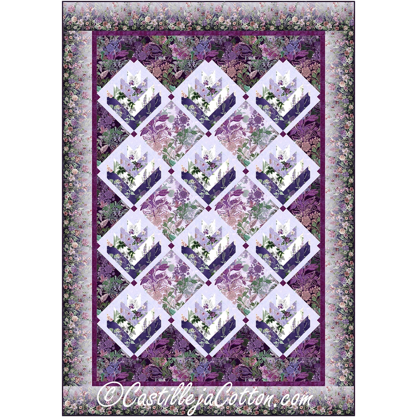 Flower log cabin blocks with filler blocks using a large motif fabric. Fabric shown in the sample quilt is Hoffman CA Fabrics Botanical Charm (Available 2024-04-01). Colors: purple, mauve