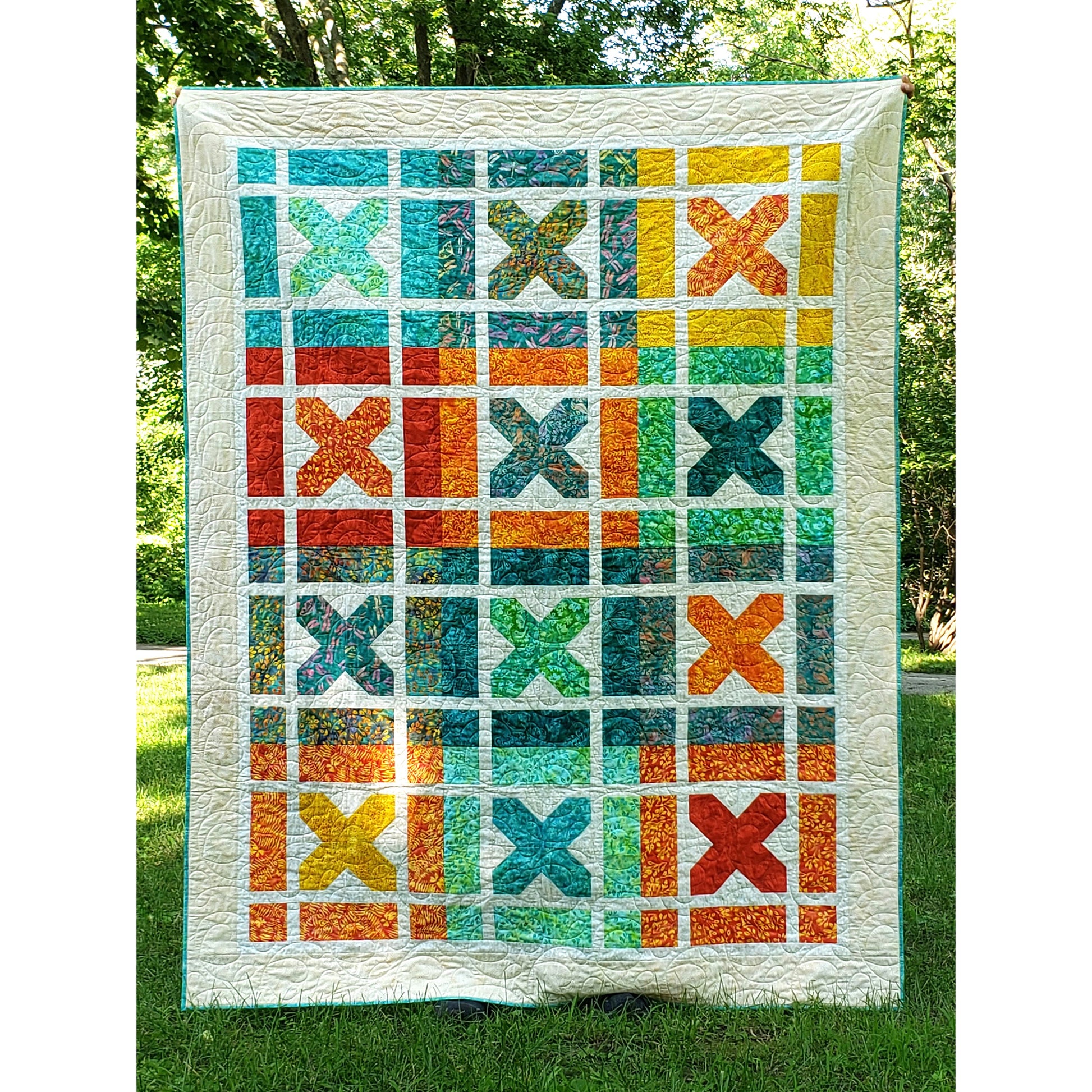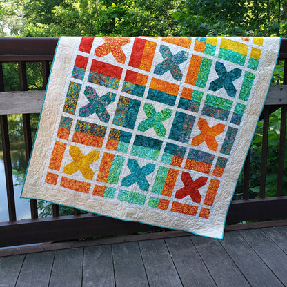Enjoy making charming blocks in any color scheme or fabric. Suitable for confident beginners, this fat quarter-friendly design features sashing built into large blocks to avoid measuring and sewing long sashing strips, as well as stitch-and-flip construction for easy piecing. Pattern includes directions to substitute a hug block (O) for any kiss block (X).