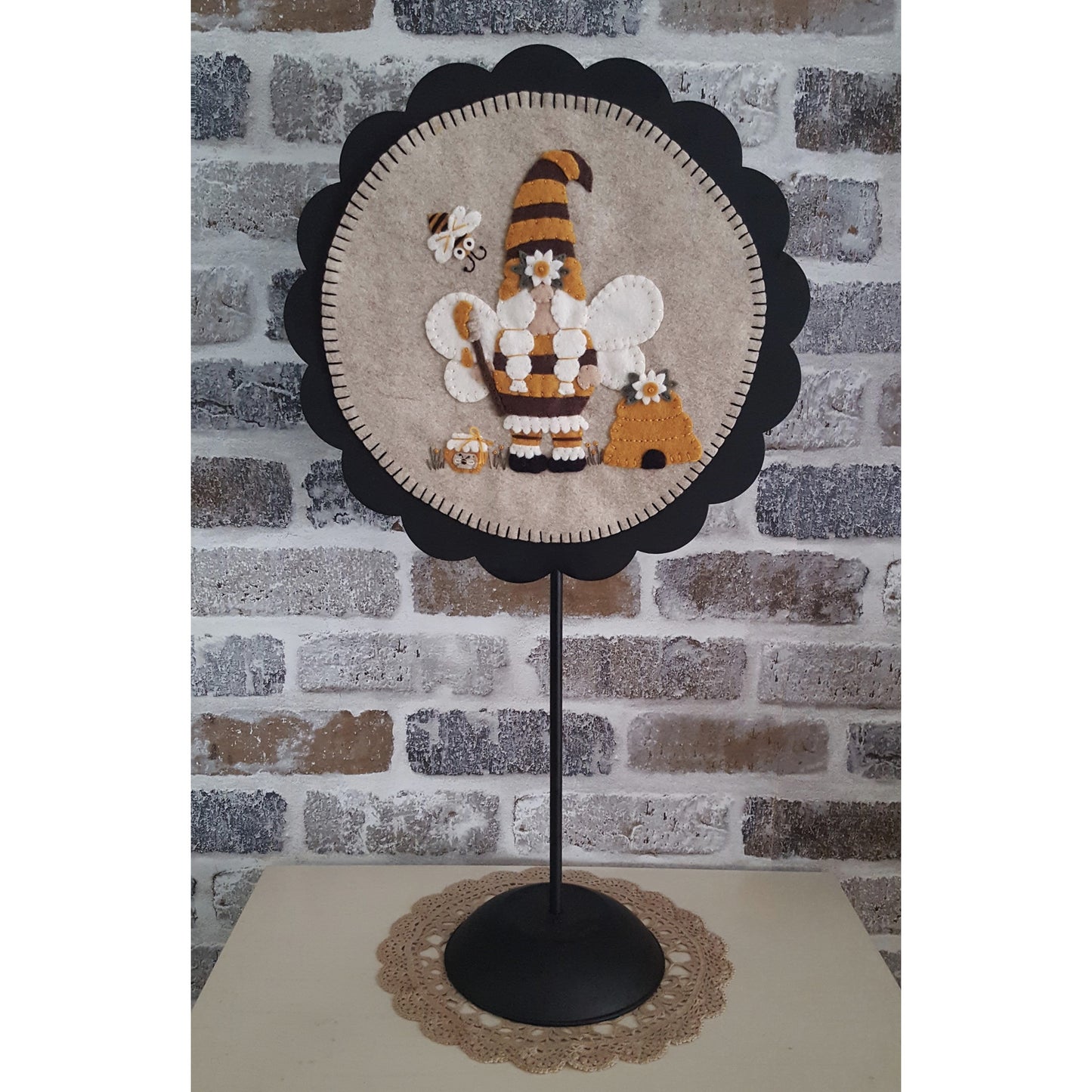 This is just the sweetest little gnome ever! Such a fun summer design to display! Shown here on a metal stand, but there's also a template included for a 12" scalloped base, just in case you don't have the stand. The round mat measures 10 inches. Create this fun design using wool felt or wool.