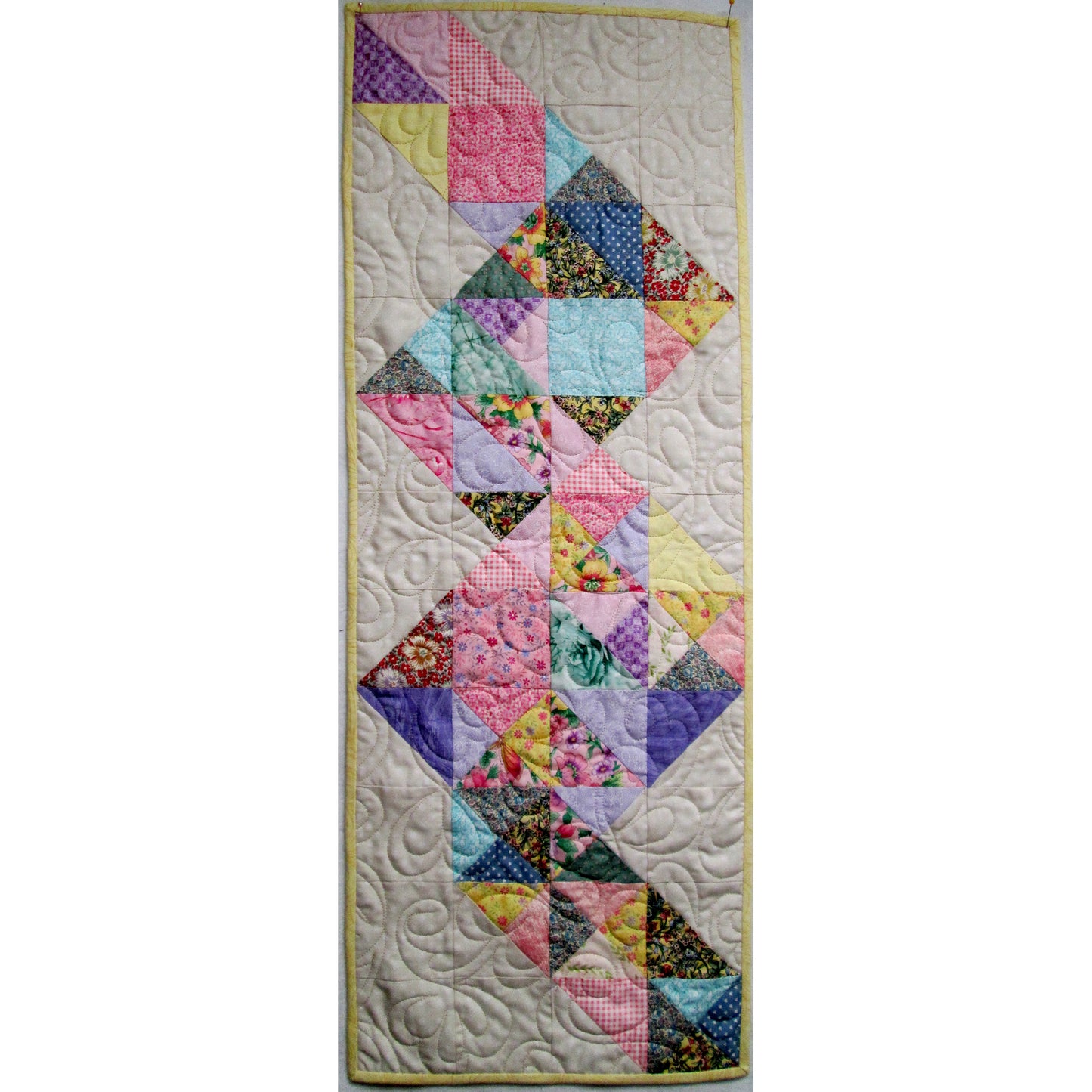 Charm pack squares are used to make half square and quarter square triangles for a simple to assemble table runner, with or without a border.