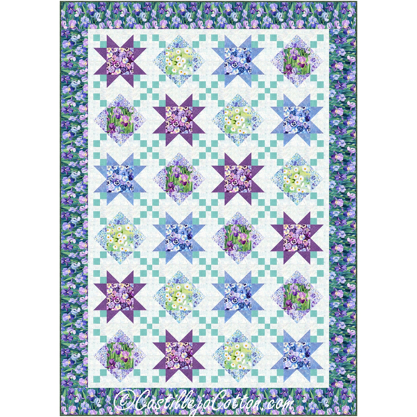 Two pieced blocks with floral centers with sashing and chains. Fabric shown in the sample quilt is Hoffman CA Fabrics Color in Bloom (Available 2025-02-01). Colors: purple, blue, green, cream.