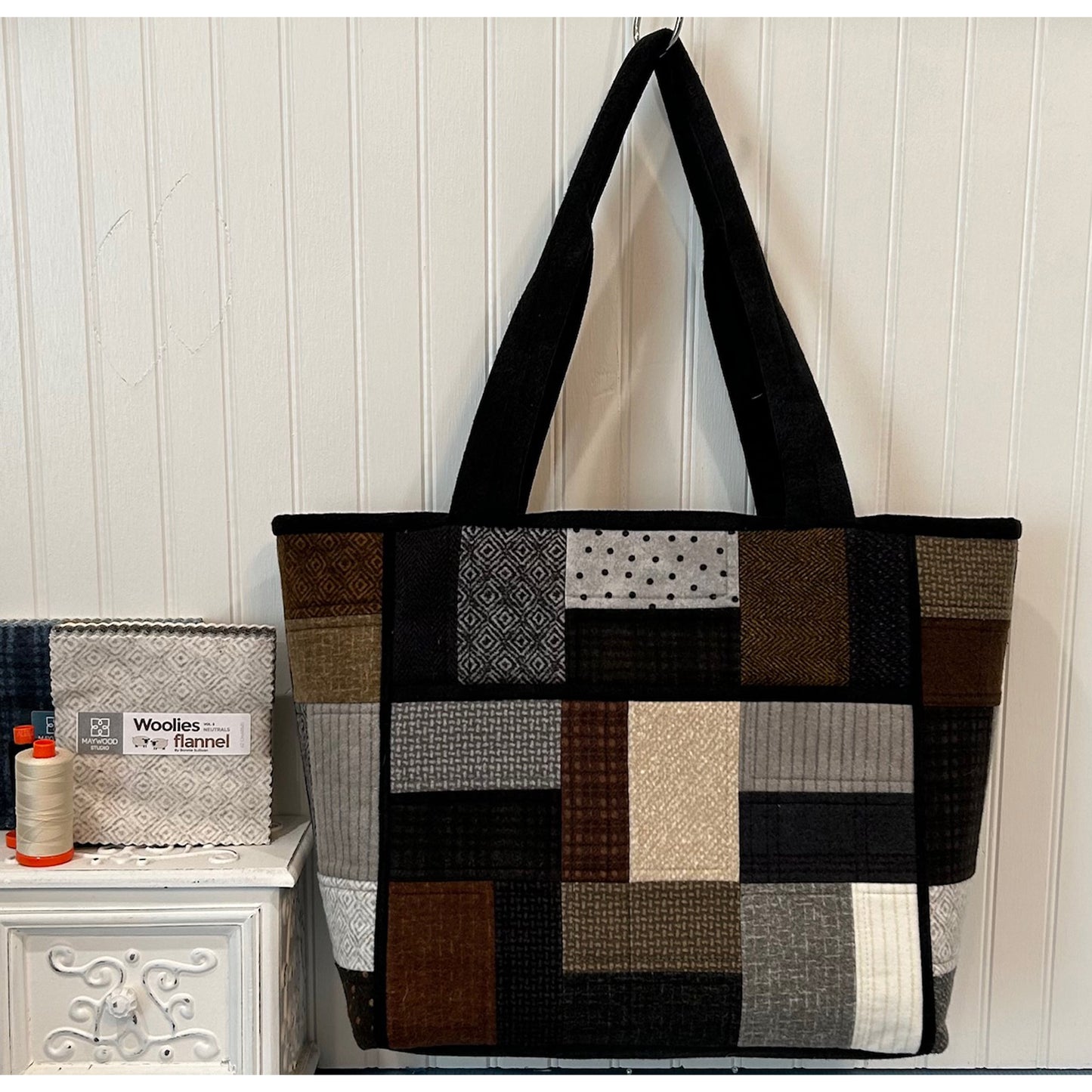 Stitch this fashionable tote using a Charm Pack and coordinating fabric. This tote will hold your wallet, fat quarters, patterns and swatches all in one place while visiting quilt shops or on a retreat. It has a back zippered pocket for your phone and quilt money.