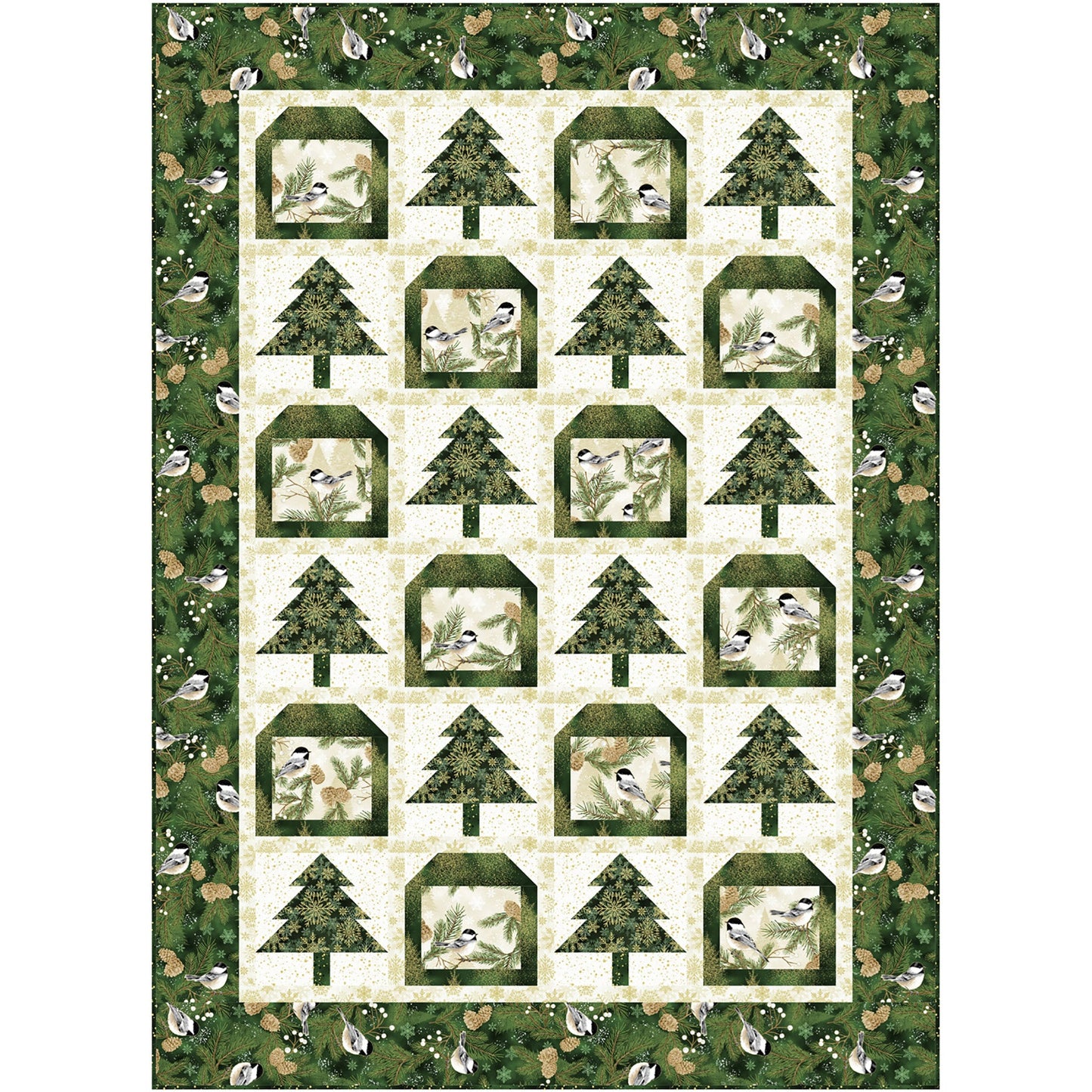 Pieced trees with pieced bird feeders. Fabric shown in the sample quilt is Hoffman CA Fabrics Winter's Eve (Available 2024-06-01). Colors: green, gold, white