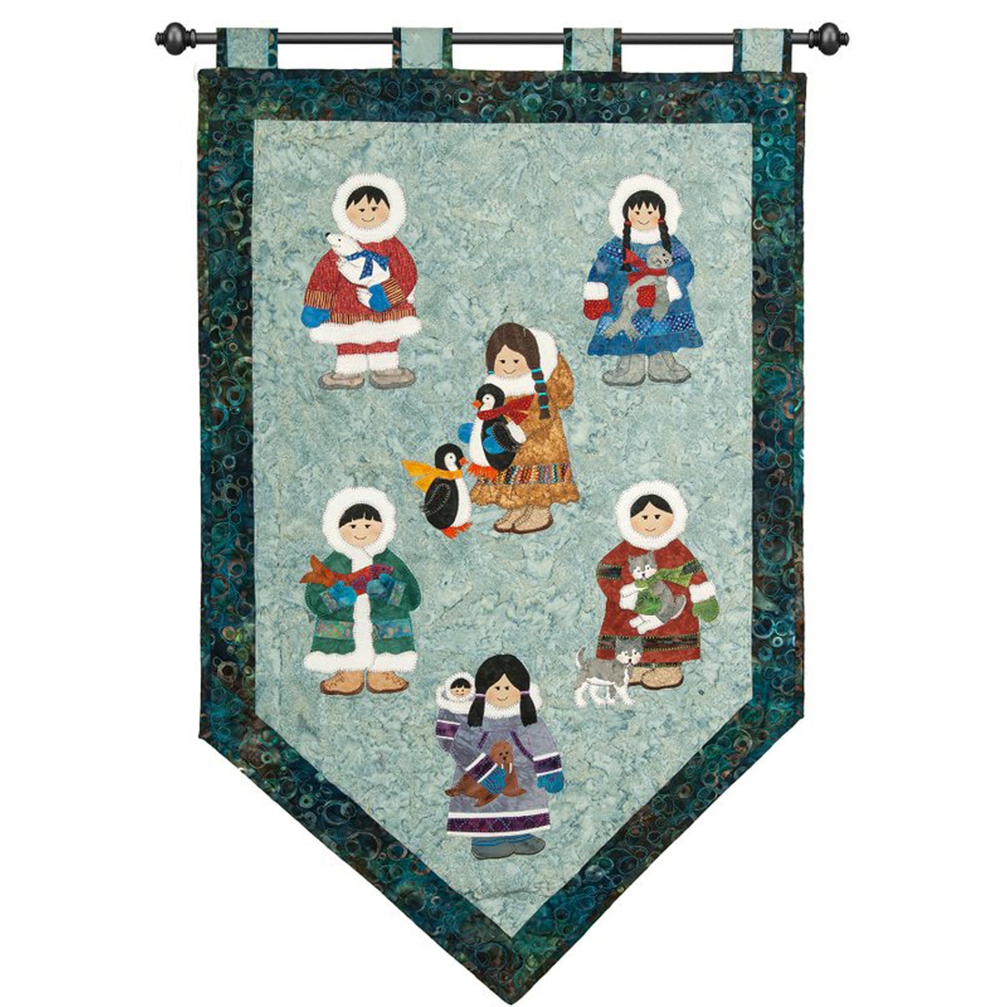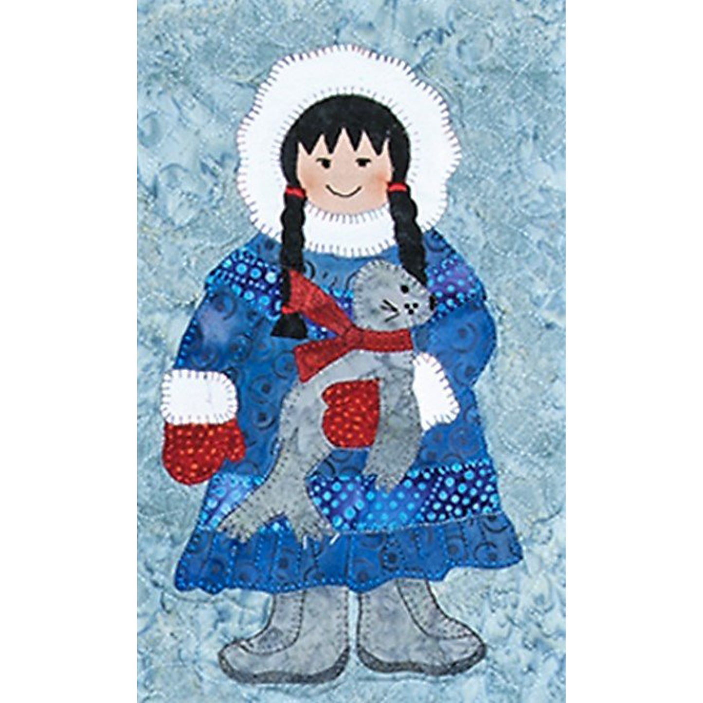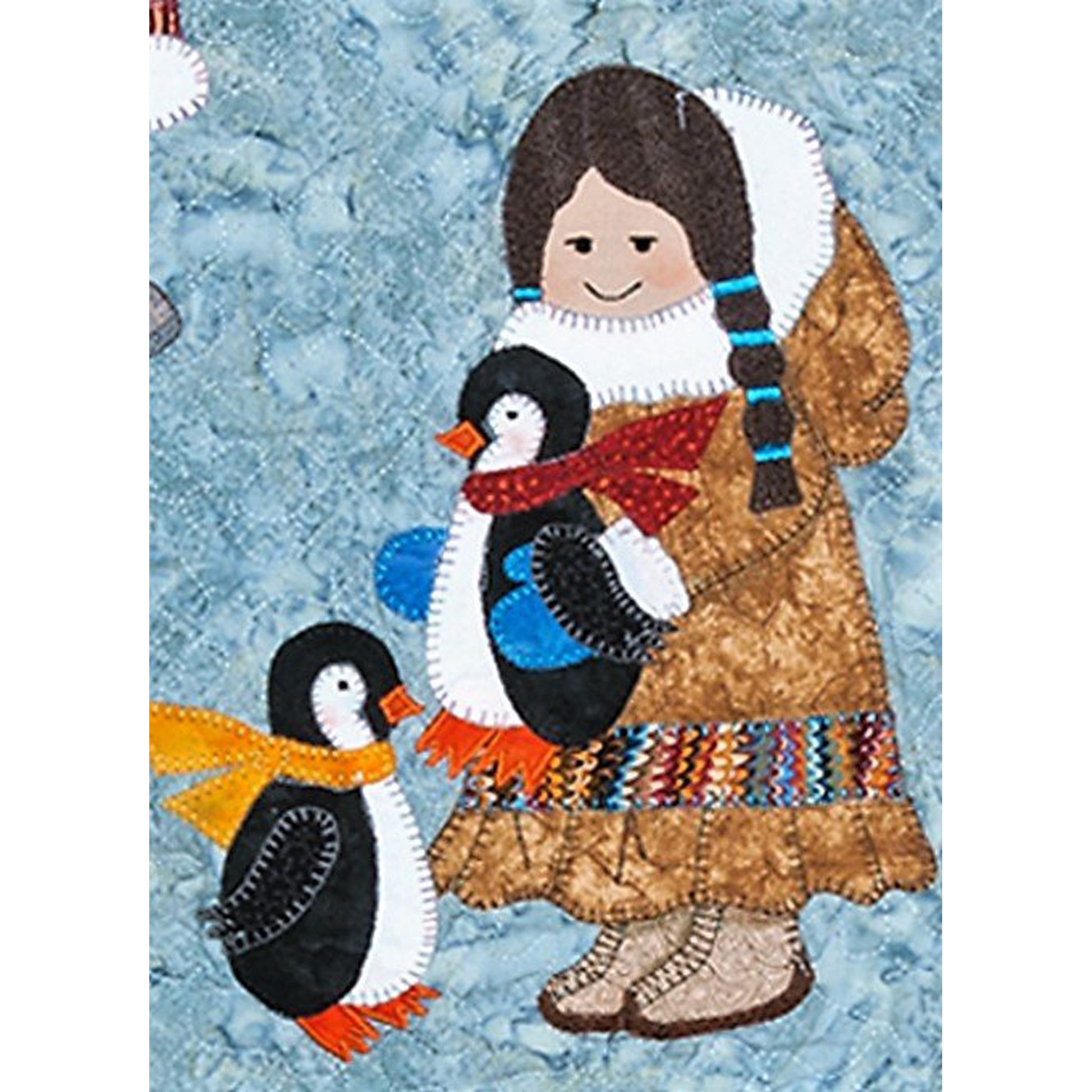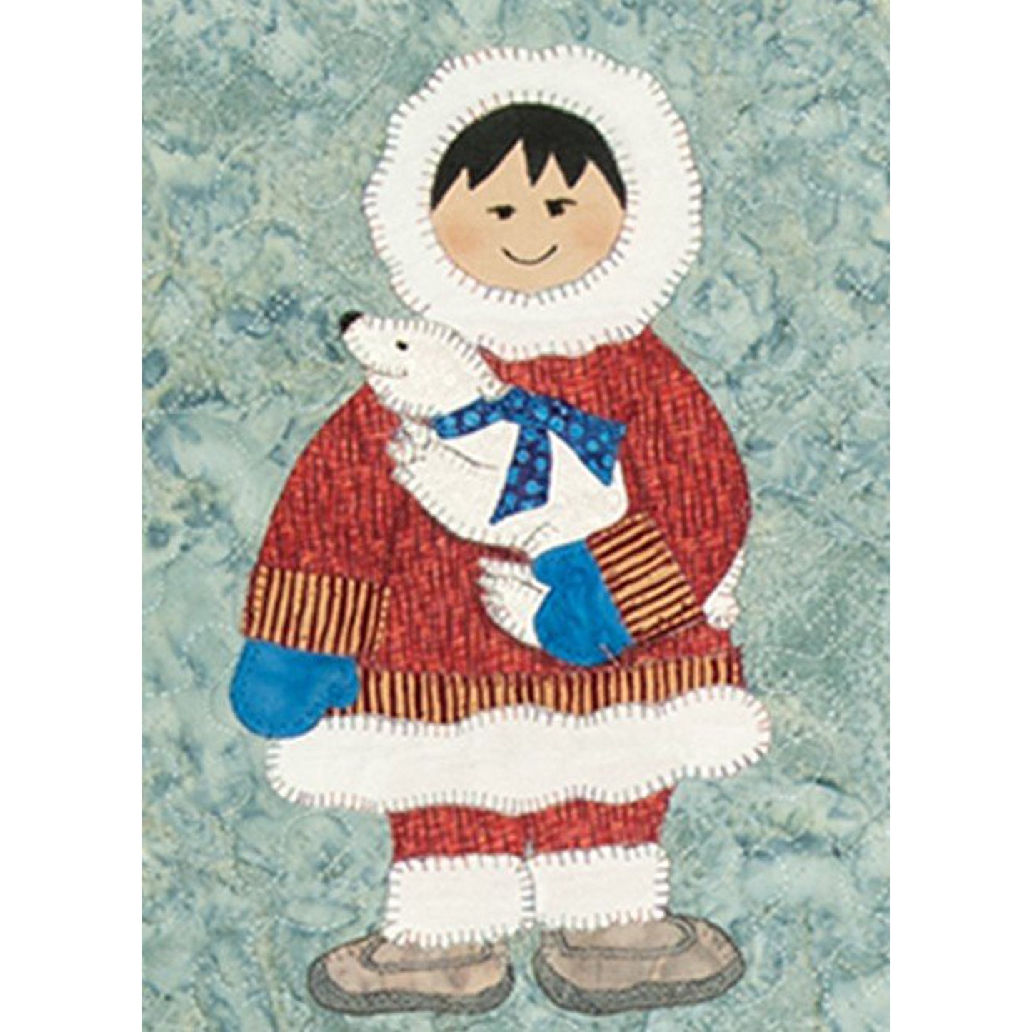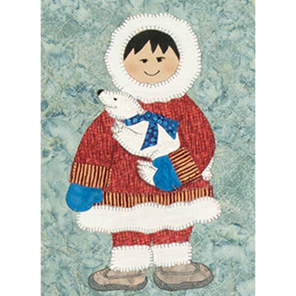 How cute are these neighbours to the North. Six little children dressed in traditional garb hugging tightly onto their favourite friends (polar bear, seal, penguins, salmon, huskies and walrus). After completing the large wallhanging, we thought that it would make an adorable Christmas project, so the pattern and cover depicts one girl in Christmas fabric with a seasonal tree decorated with coloured bulbs. This wallhanging is a machined appliqué project. Finished Size 25 1/2" x 41" Christmas 14" x 19".