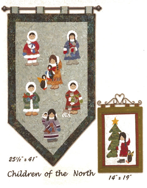 How cute are these neighbours to the North. Six little children dressed in traditional garb hugging tightly onto their favourite friends (polar bear, seal, penguins, salmon, huskies and walrus). After completing the large wallhanging, we thought that it would make an adorable Christmas project, so the pattern and cover depicts one girl in Christmas fabric with a seasonal tree decorated with coloured bulbs. This wallhanging is a machined appliqué project. Finished Size 25 1/2" x 41" Christmas 14" x 19".