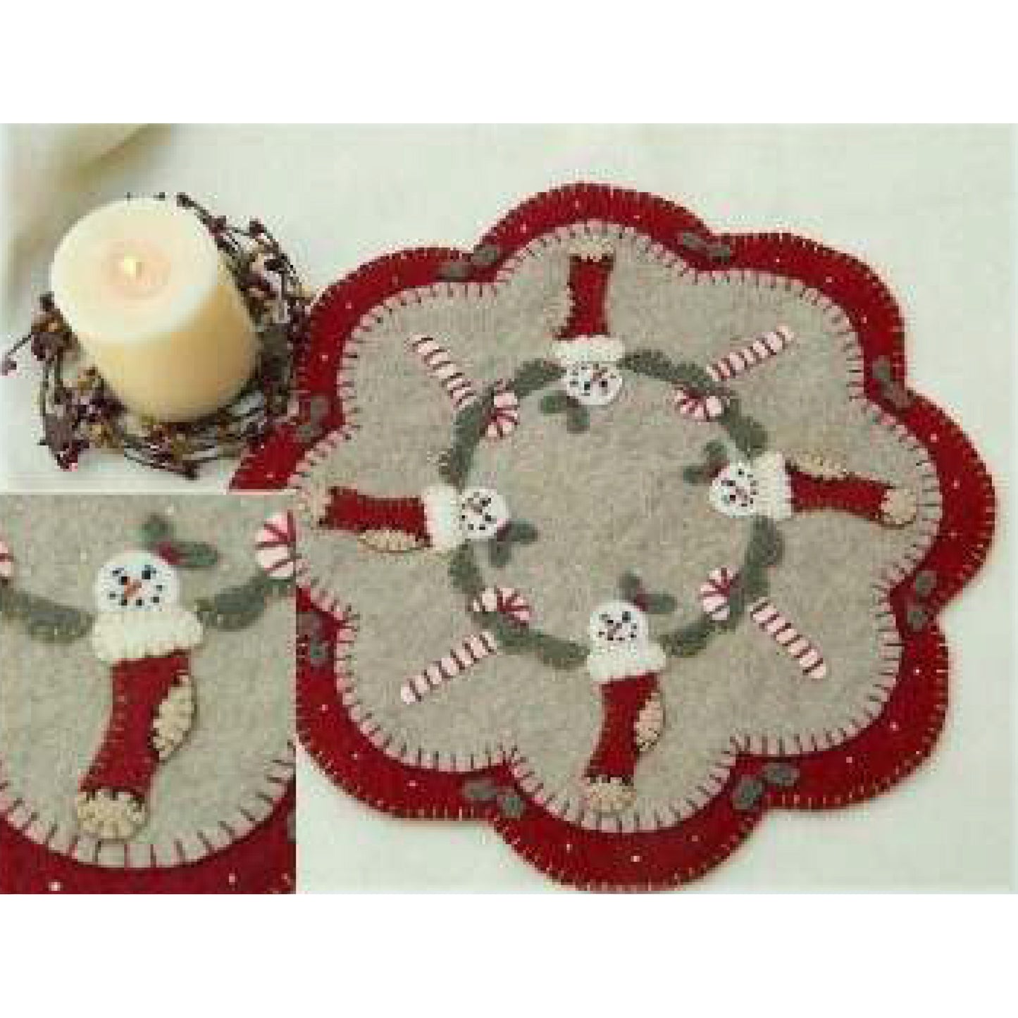 Adorable little snowgirls peek out of the tops of their Christmas stockings. Create this sweet candle mat pattern with wool felt or wool. It measures 13 inches and is sure to be a Christmas treasure for you or a special gift for someone you love!