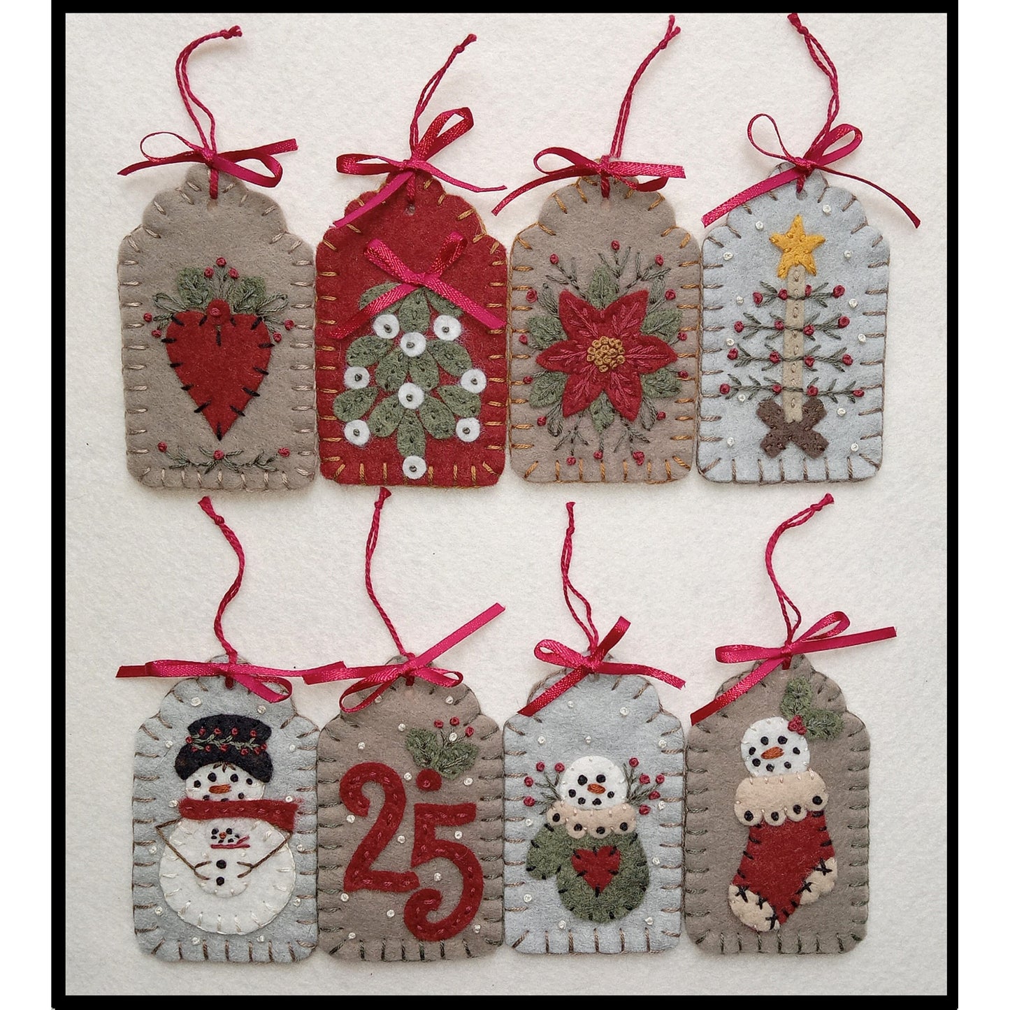 Add some homemade charm to your gift packages or Christmas tree with these sweet little tags! Each one measures 2 inches wide by 3 1/4 inches long and are made from wool felt. They stitch up quickly so why not make some for little gifts too? They are sure to be treasured by family & friends!