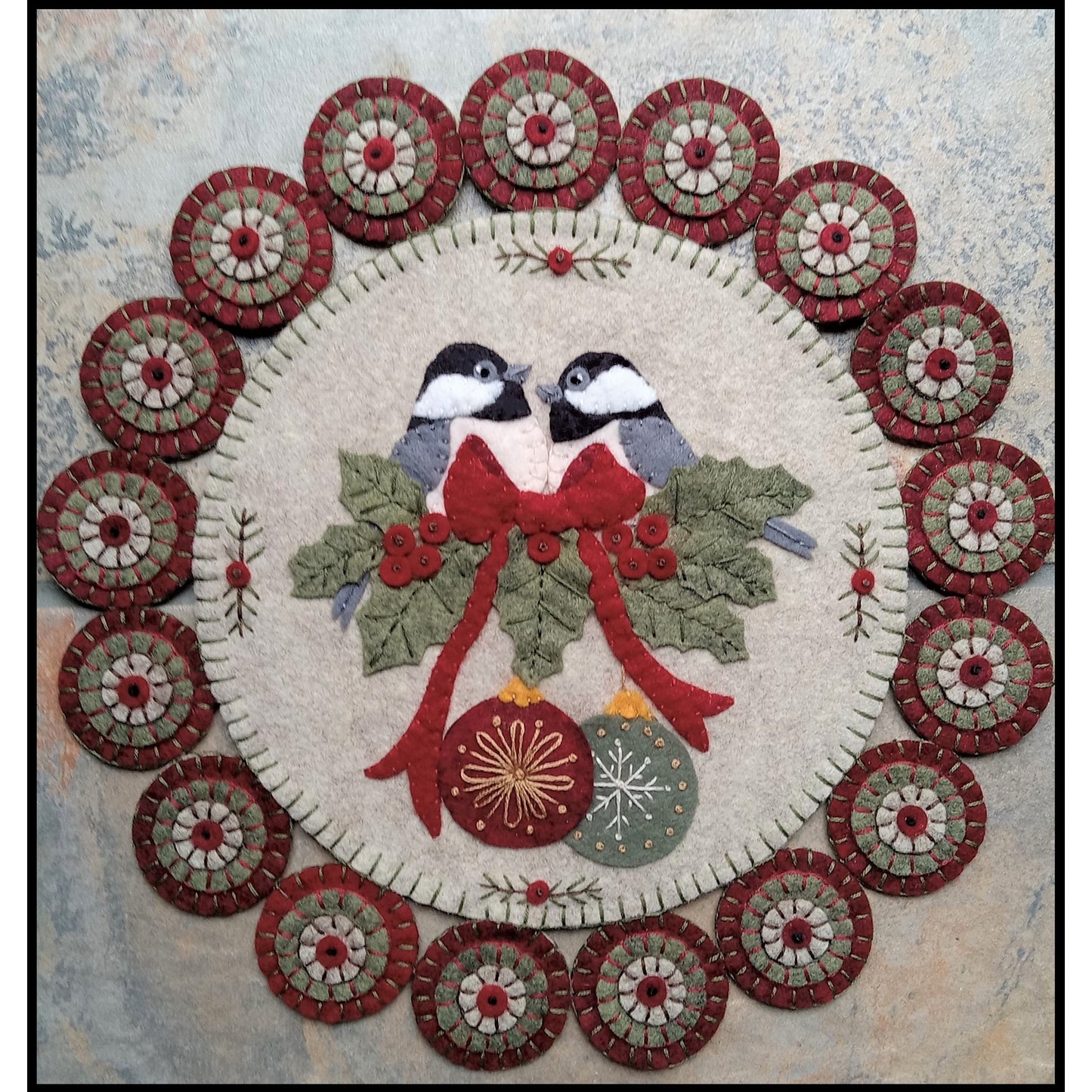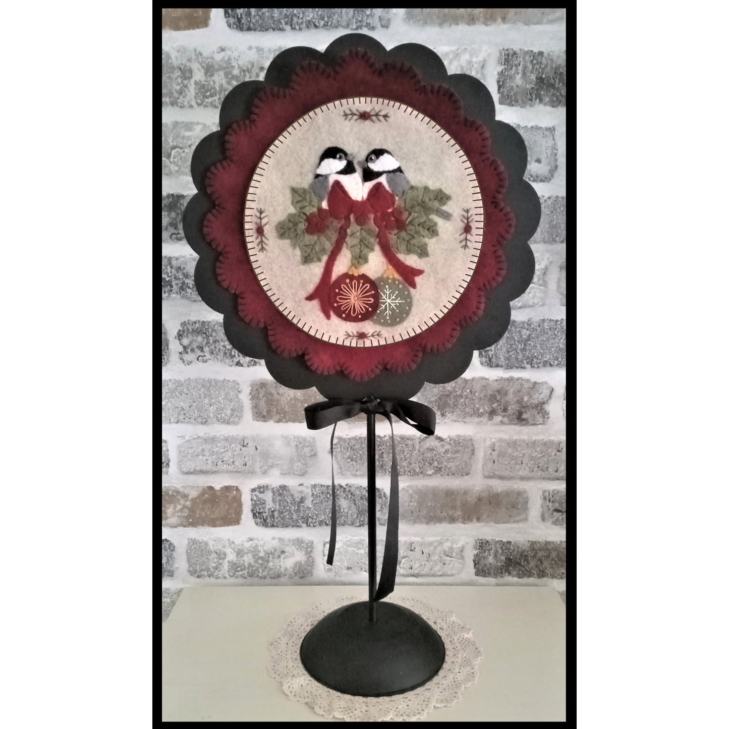 There's just so much Christmas charm in this sweet chickadee penny rug! Stitch it up with the pennies or add the scalloped base, as shown here on a pretty metal stand. Either way, it's sure to dress up your holiday decor and bring lots of compliments! The penny rug measures 11 inches and the scalloped mat measures 10 inches. Create one, or both using wool, wool felt, or bamboo felt and enjoy all season long!
