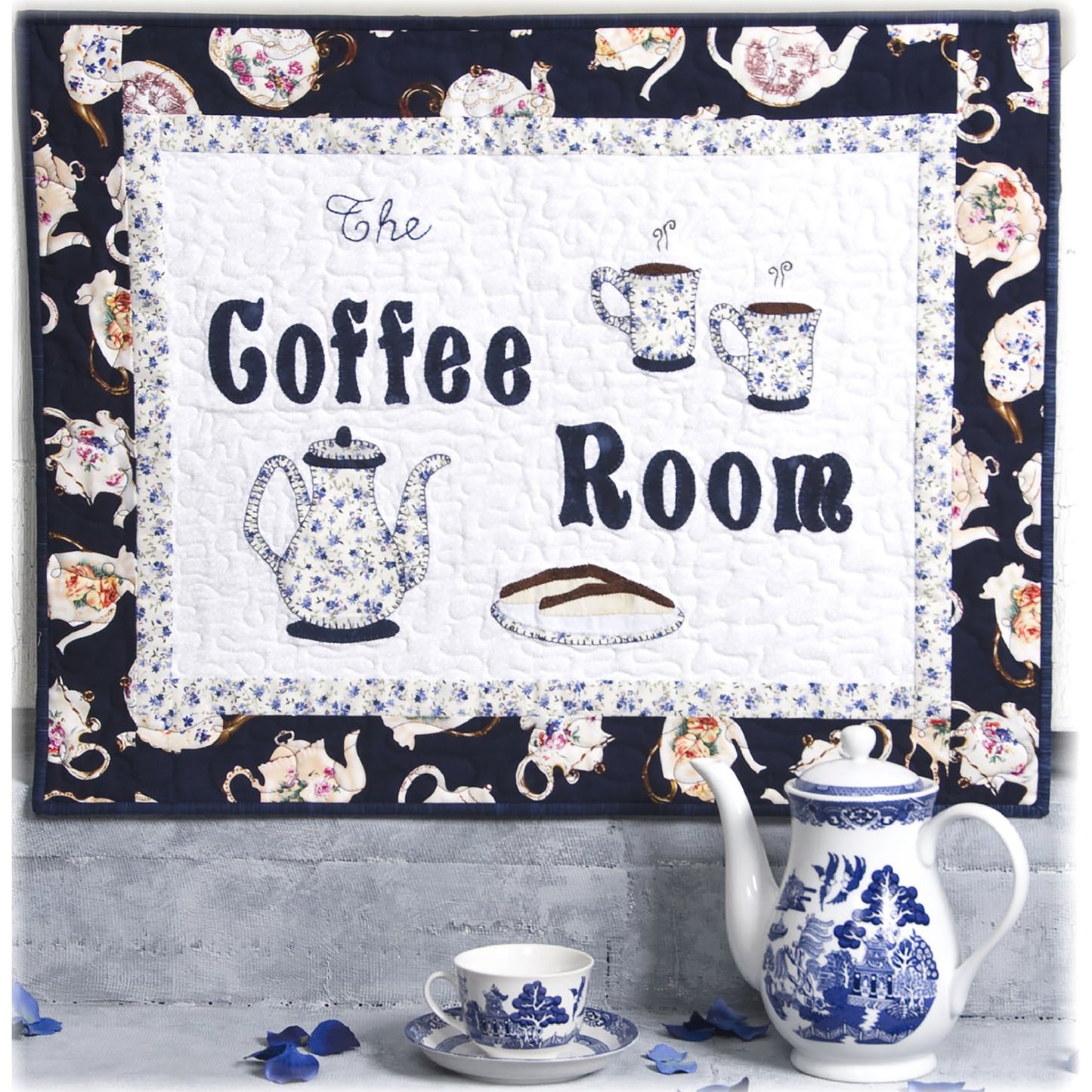 Bonus pattern. Coffee pot and cups applique wall hanging pattern.