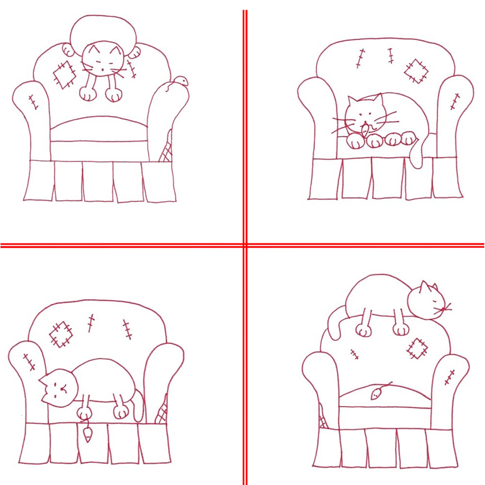 Stitch up some adorable cats with this Redwork embroidery pattern that features 4 comfy kitties on a couch.
