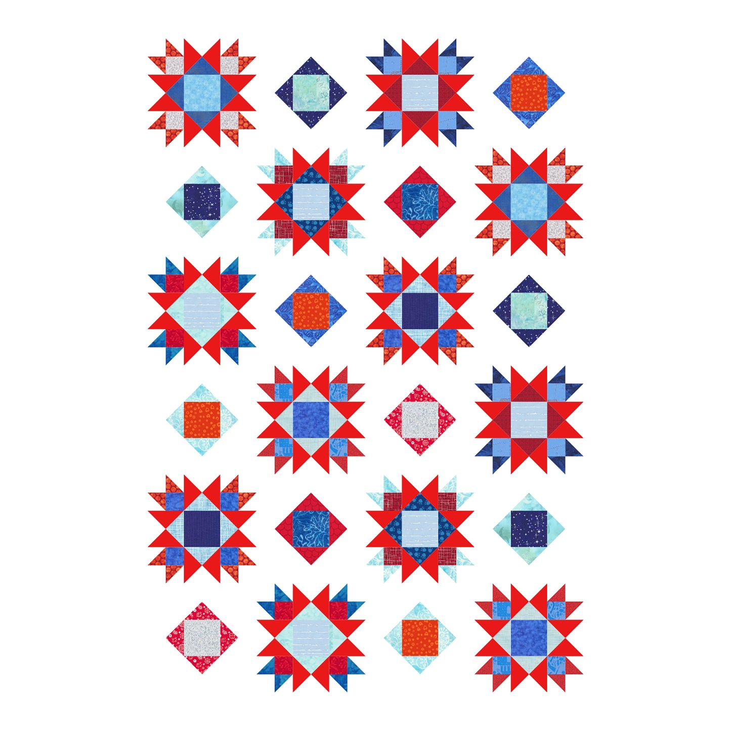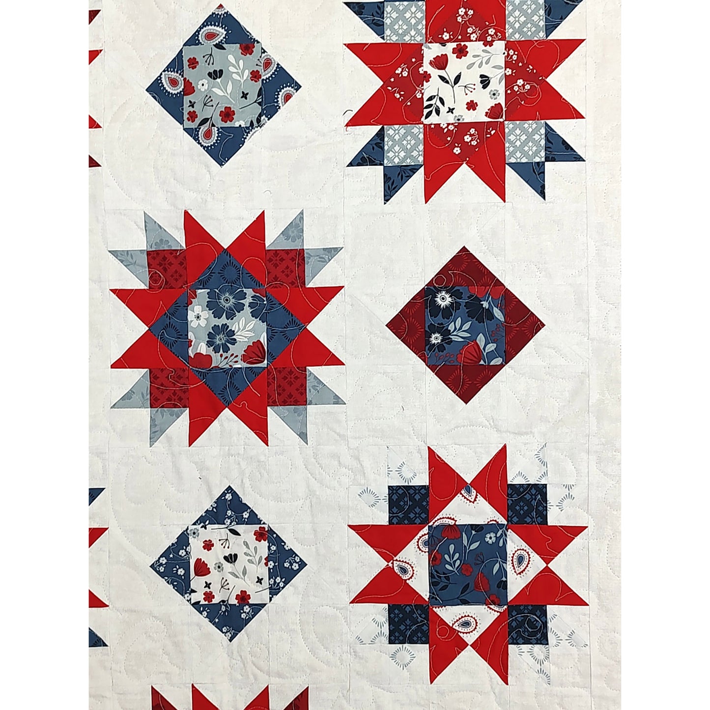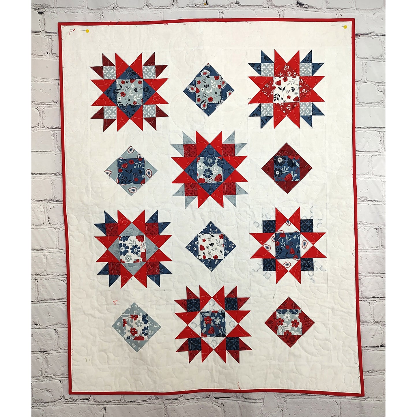 Grab a charm pack or two and a matching fabric plus a background fabric and make these fun Contrary Wife blocks and alternate blocks for a cute and simple looking quilt. Fabric shown in the sample quilt is Riley Blake “American Beauty” fabrics.