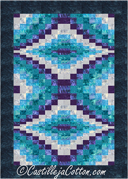 Two repeated blocks using 8 fabrics.  Fabric shown in the sample quilt is Banyan Batiks Color Me Banyan Cosmos Cool (Available 2023-09-01)Sample quilt using Fabric: Banyan Batiks Color Me Banyan Cosmos Cool