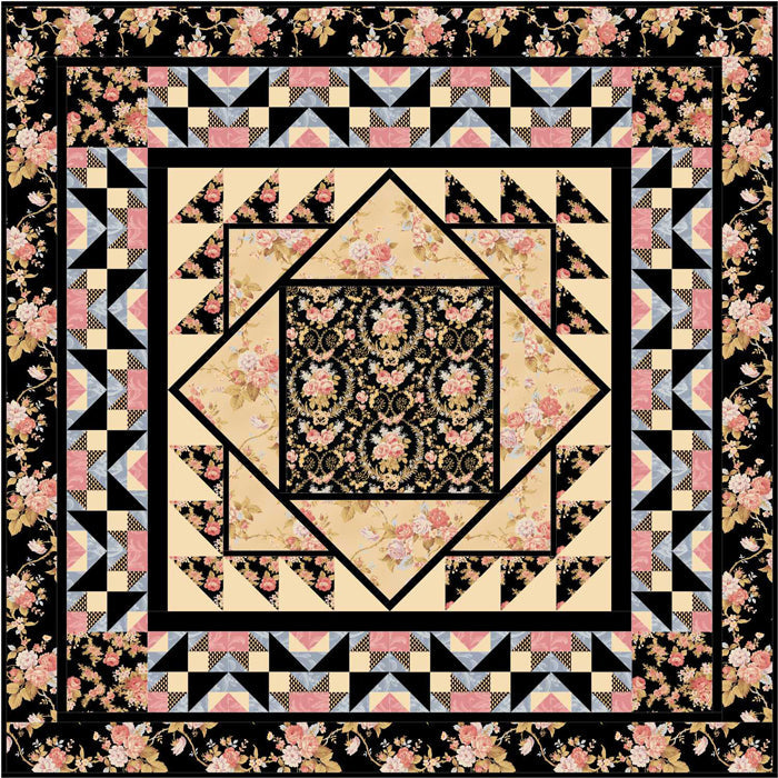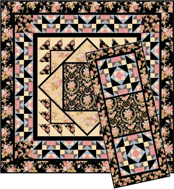 Medallion quilt pattern and matching table runner are created with Robyn Pandolph's World of Romance collection by RJR Fabrics. This quilt pattern can be made with any large floral and coordinating light and dark fabrics.