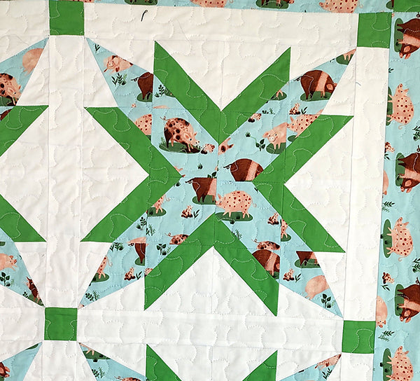 The sample quilt is made with a cute piggy fabric and the blocks are unique and sort of looked like skewers or Kabobs, there’s a cut of pork called Crown roast that looks like a crown with bones sticking out the top, so that’s how the quilt got its name.