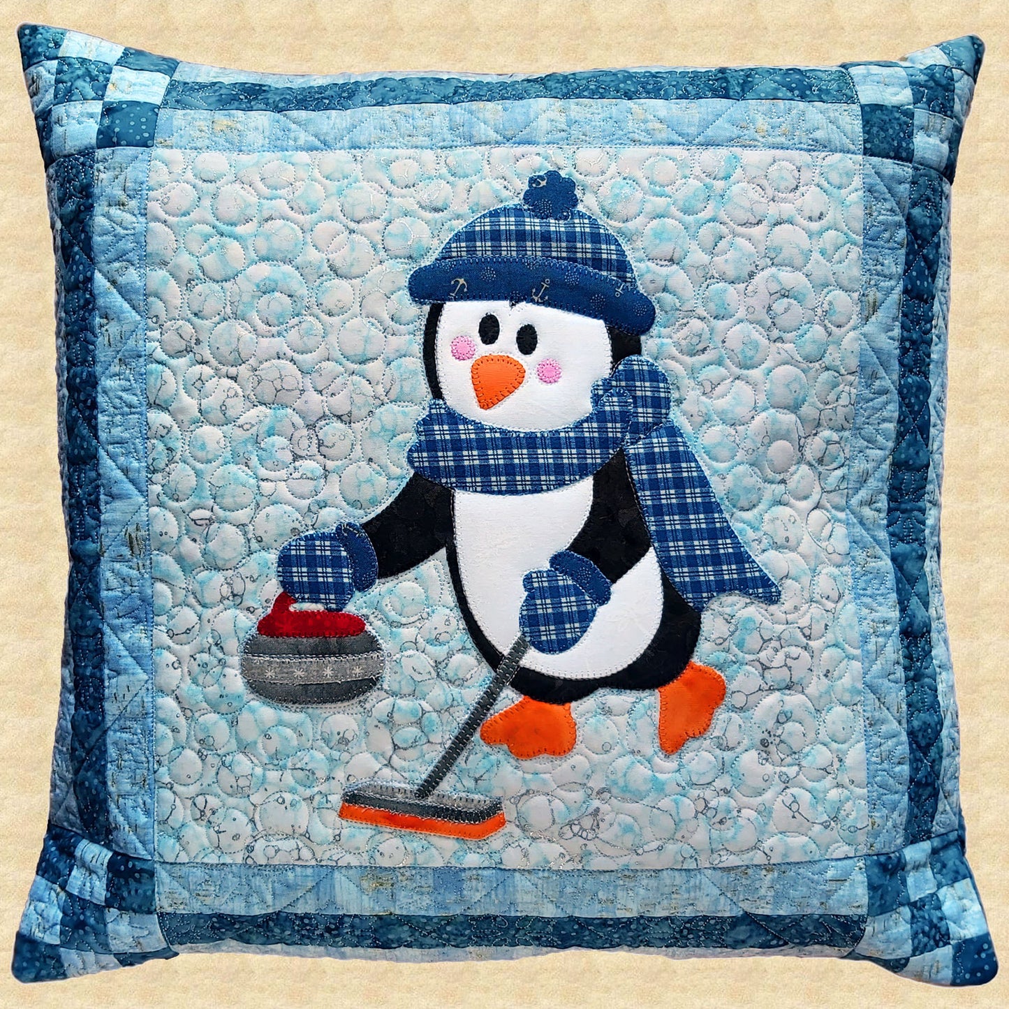 Pillow pattern featuring an appliqued penguin.