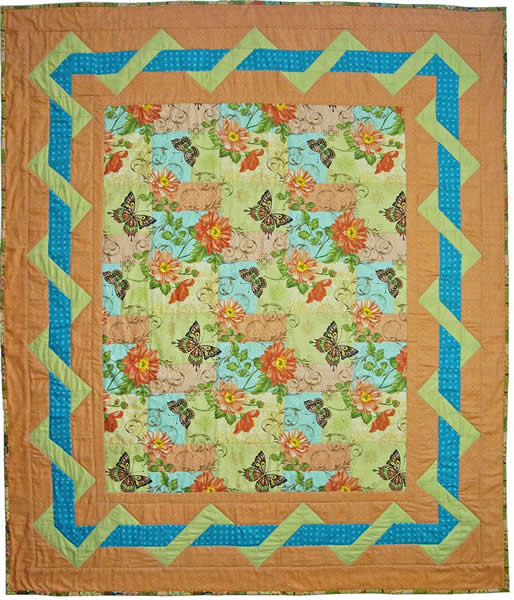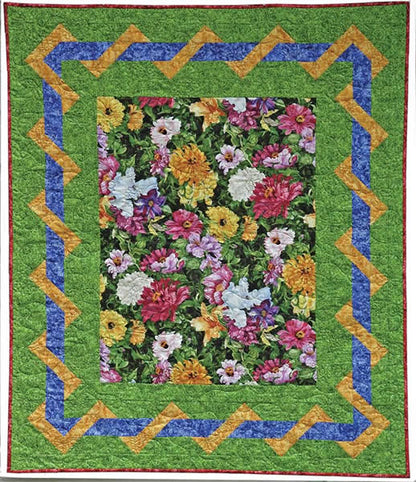 Make a baby quilt showcasing that special large scale fabric or panel print in the center of the quilt. Interweaving borders capture a playful spirit, thus the name of this quilt pattern, Dancing Around.