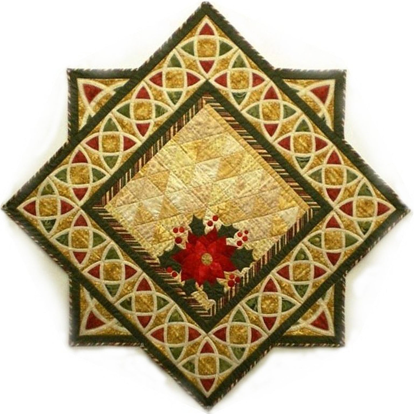 This festive holiday table runner pattern features a gold one-patch background made of 60 degree triangles easily pieced in rows. The poinsettia and holly applique are applied with fusible web and machine appliqued in place. The border only looks difficult. The fabulous "celtic-look" arch blocks are fused and machine appliqued making them simple and fast to complete. The side arches and bias striped border add wonderful detail and a rich look to this beautiful holiday pattern.