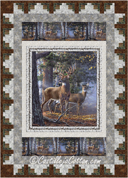 Deer panel with log cabin borders. Fabric shown in the sample quilt is Northcott Fabrics First Light (Available 2023-11-01). Colors: brown, cream, grey, green