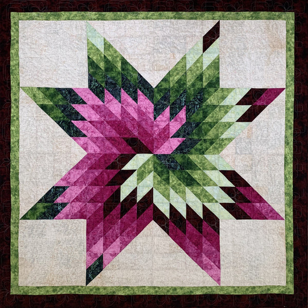 Karen has created a new way to create Lone Star designs without diamonds! So easy to do! The quilt is a beautiful spiral of green and burgundy. Use the colors in the pattern or your can select your own colors to use in this pattern.