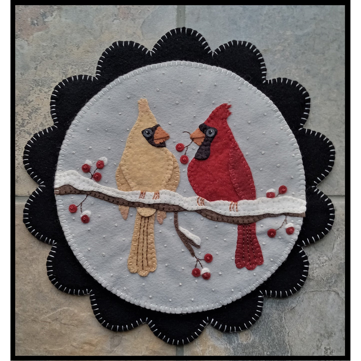 This sweet cardinal couple is a pleasure to stitch up! Shown here on a scalloped metal display stand, but there is also a template for stitching the scalloped layer as shown in the second photo. The round version measures 10 1/2 inches and the scalloped version measures approximately 13 inches.