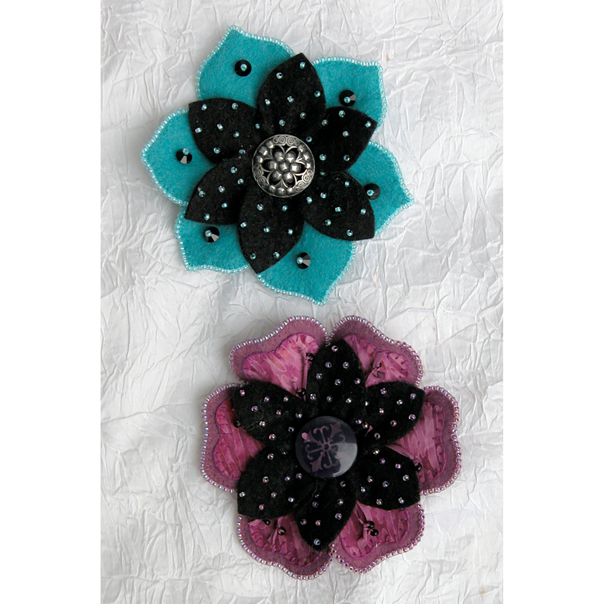 Two fun flower pin variations! One flower features "dipped" petals with an inner applique of cotton batik along with fun ribbon "stamens" while the other flower features pointed petals with accent embellishment of Swarovski crystals. Both flowers have an inside flower that is "scatter beaded" with seed beads and both showcase a beautiful centerpiece button. The techniques used in either flower pin can easily be interchanged with the other pin, so there's a lot more than just two flowers in this pattern!