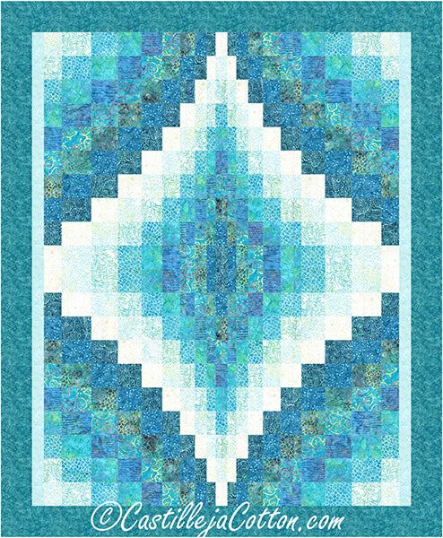 Strip pieced with two repeated blocks. Fabric shown in the sample quilt is Timeless Treasures Fabrics Tonga Splash. Colors: teal