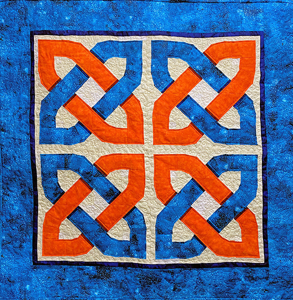 Double Loop Wall Hanging is a foundation paper-pieced pattern. A single block is turned to create the interlocking loops. The overlapping appearance and depth are created through integrated shadow fabric. No applique or bias tape needed. Pattern includes instructions for single color and two color variations. Also includes master paper piecing templates, cutting charts for block assembly pieces, labels for all pieces, paper-piecing primer, illustrated instructions and tips to simplify construction and minimize fabric waste.