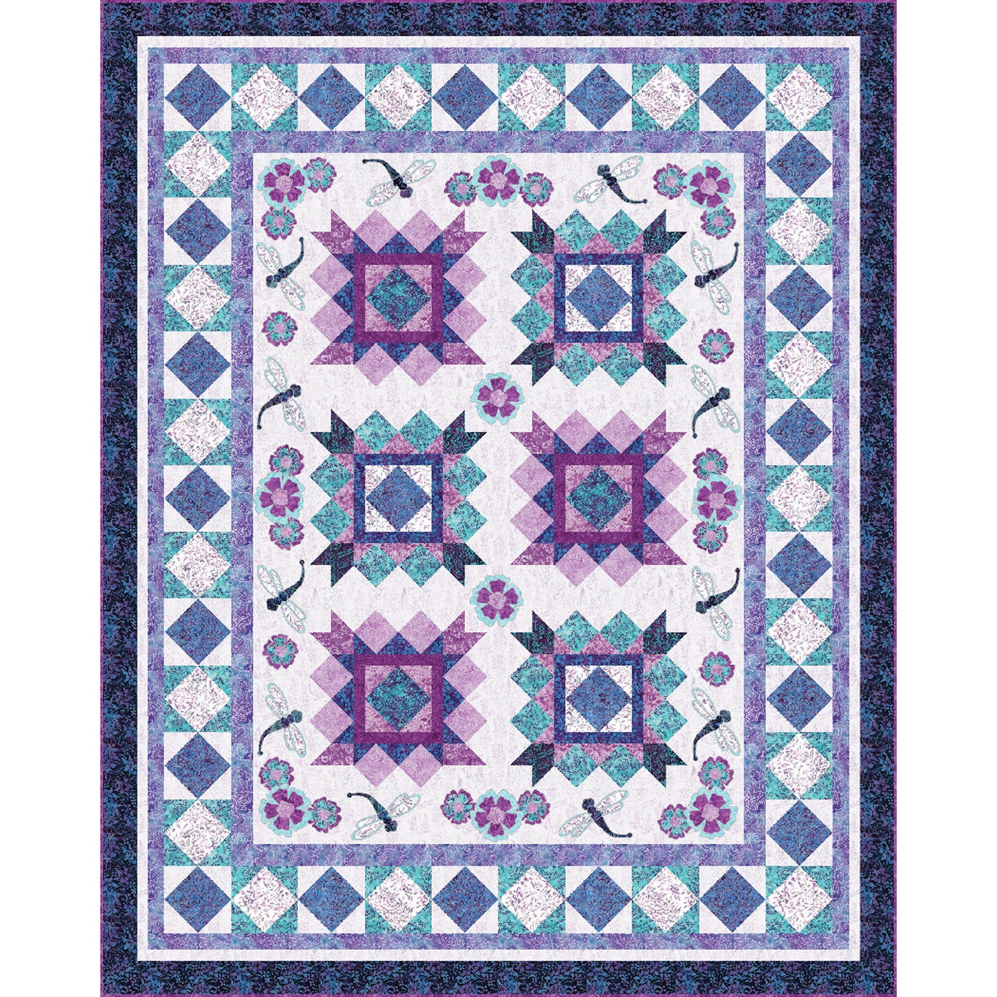 Applique dragonflies and posies embellish this beautiful quilt pattern. 6 large pieced blocks are the focal of the quilt center and a diamond in a square block border surrounds it.