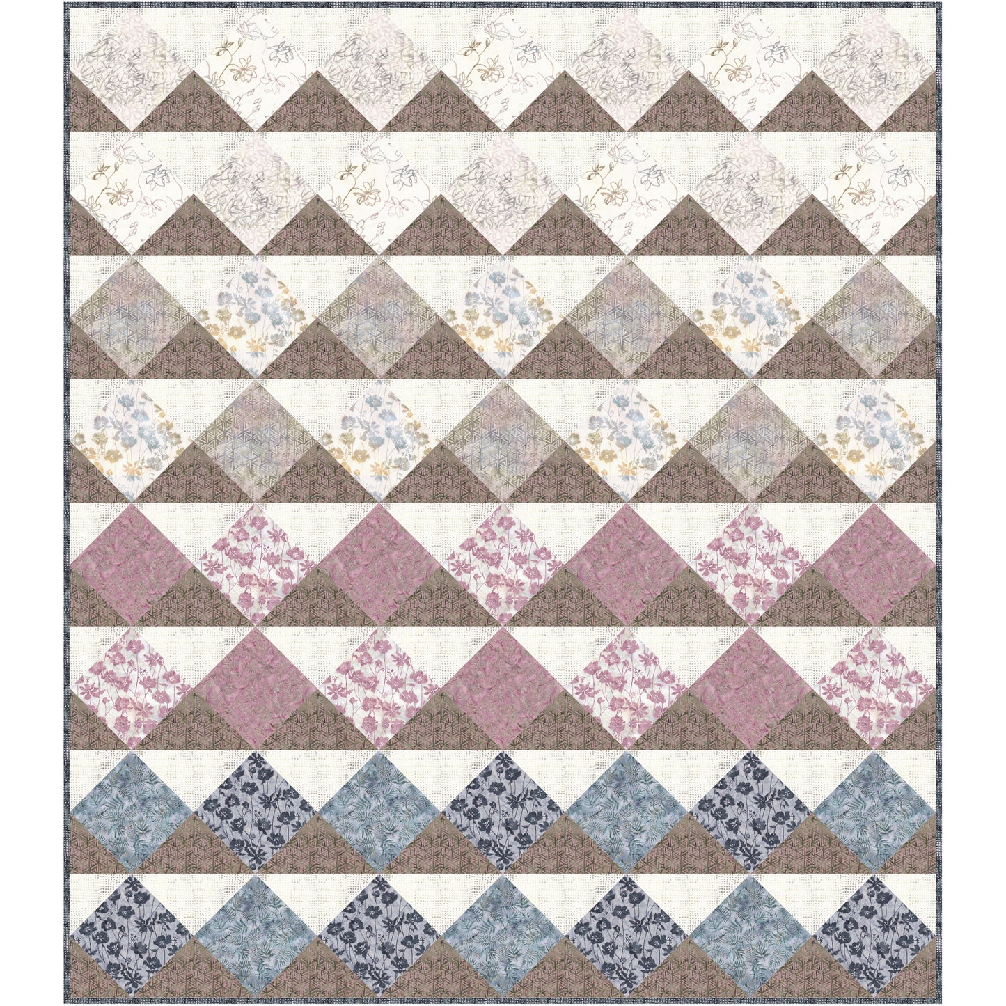Elegant contemporary quilt pattern with squares & triangles, reminiscent of a mountain range at the beginning and ending of a day. The quilt displays the soft shades of the Faye Baliscapes Batik collection by Anthology Fabrics. Quilt finishes at 71 3/4" x 82".