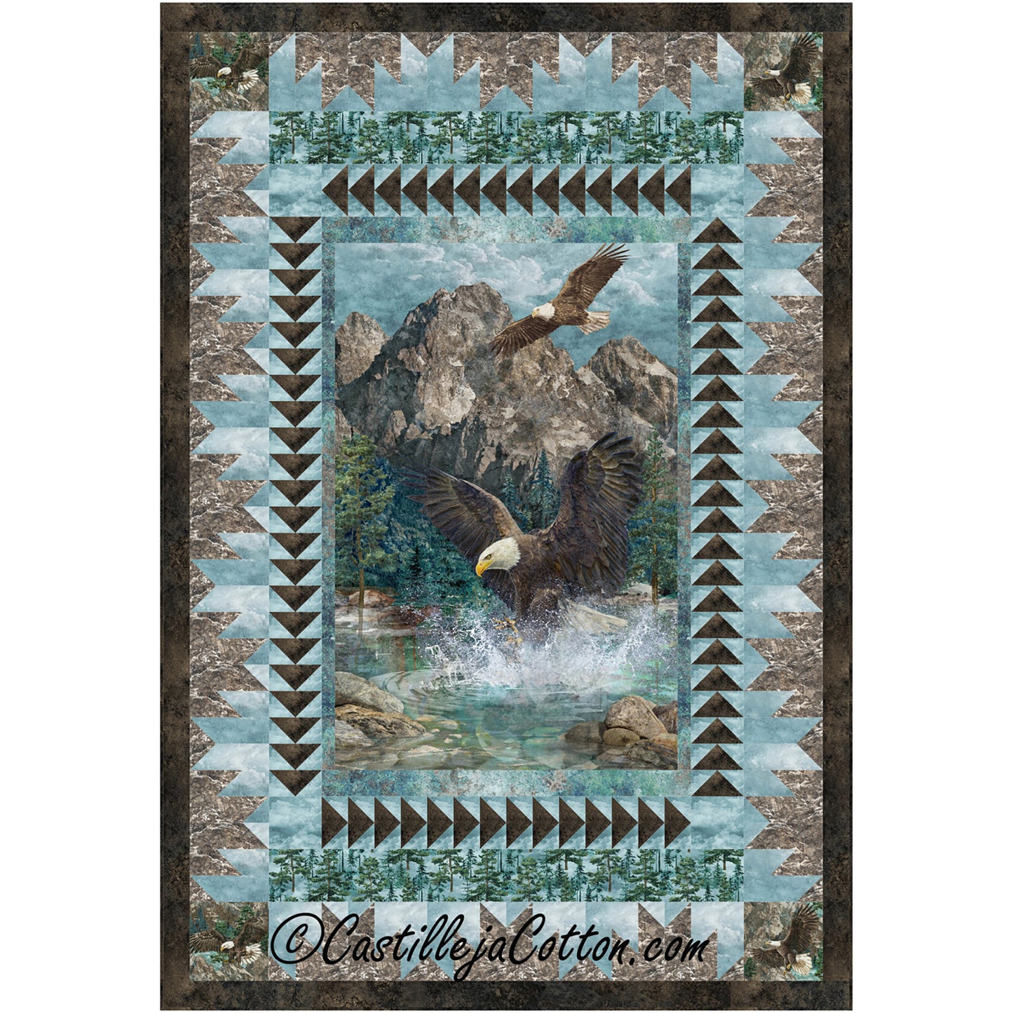 Eagle panel with flying geese and mountain borders. Fabric shown in the sample quilt is Northcott Fabrics Eagle Pass. Colors: blue, brown, grey