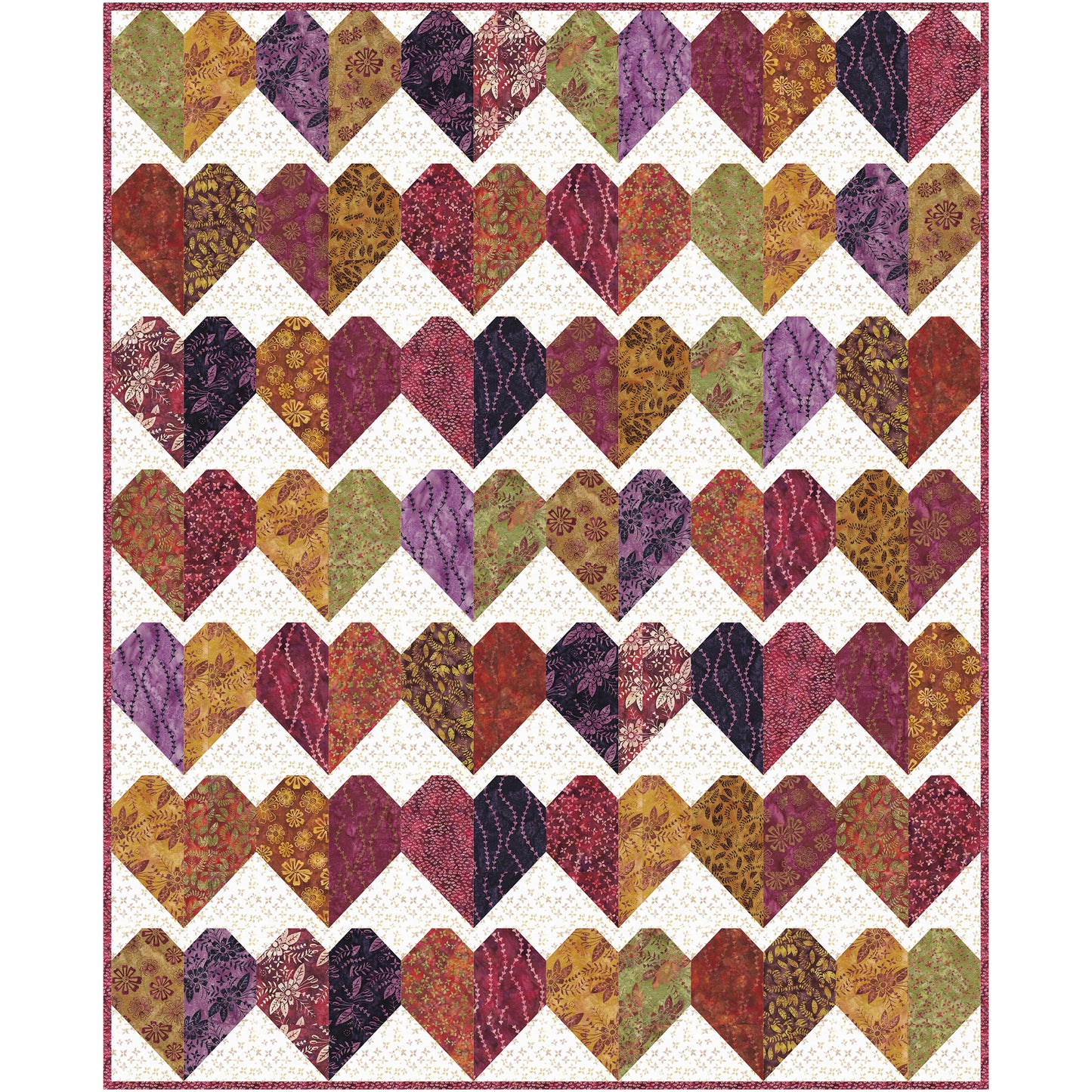 The Earthy Love quilt pattern captures the warmth and richness of autumn with a touch of heartfelt charm. Made using the stunning Earthy Enchantment fabric collection by Tiffany Hayes for Island Batiks, this quilt embraces fall’s deepest, most enchanting hues. The deep oranges, warm browns, rustic reds, and golden yellows in this collection evoke the beauty of nature in the fall, bringing the comfort of the season into your home. This quilt features a collection of heart-shaped blocks, each made from 10" squares, creating a beautifully balanced design that feels both comforting and romantic.