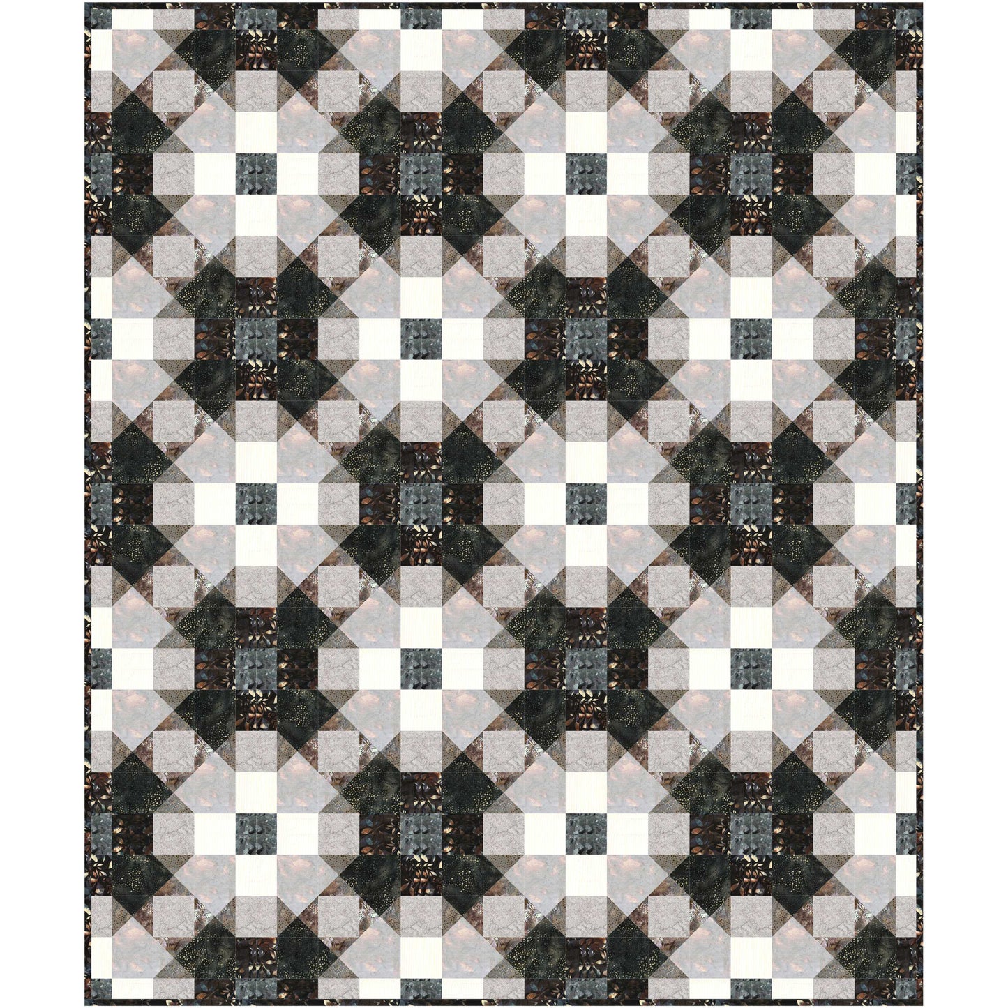 Elegant Reflections is a sophisticated quilt pattern inspired by the serene beauty of the "Skipping Rocks Batik" collection from Hoffman Fabrics (shown in example). This exquisite design combines elements of stars and the tranquil image of a reflecting pond, capturing the essence of peaceful contemplation. Shades of grey and brown create a harmonious palette, reminiscent of weathered stones and earthy textures. Quilt finishes at 60" x72".