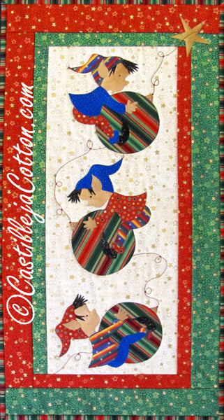This fusible applique wall hanging would be a fun addition to your Christmas decor. Easy to make elves swinging on ornaments wall hanging.